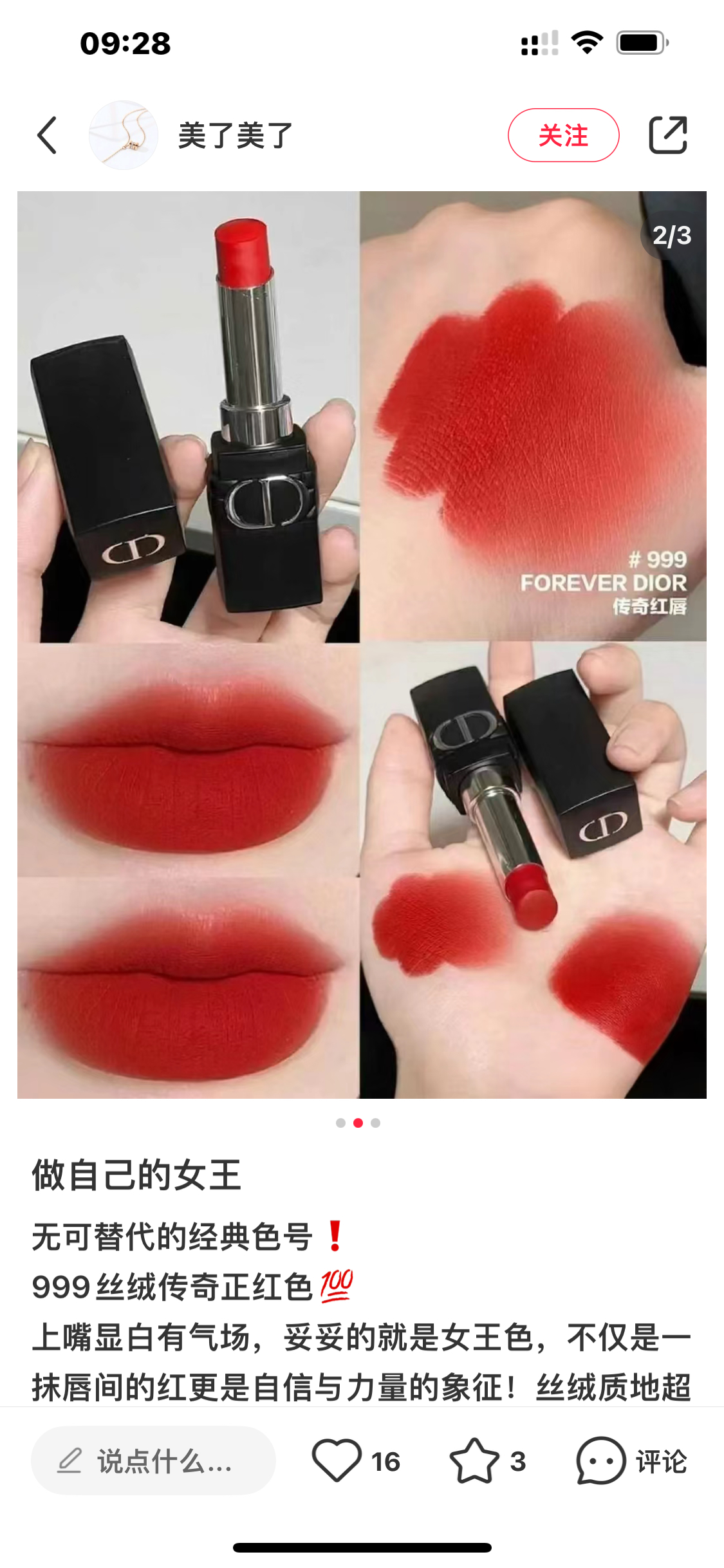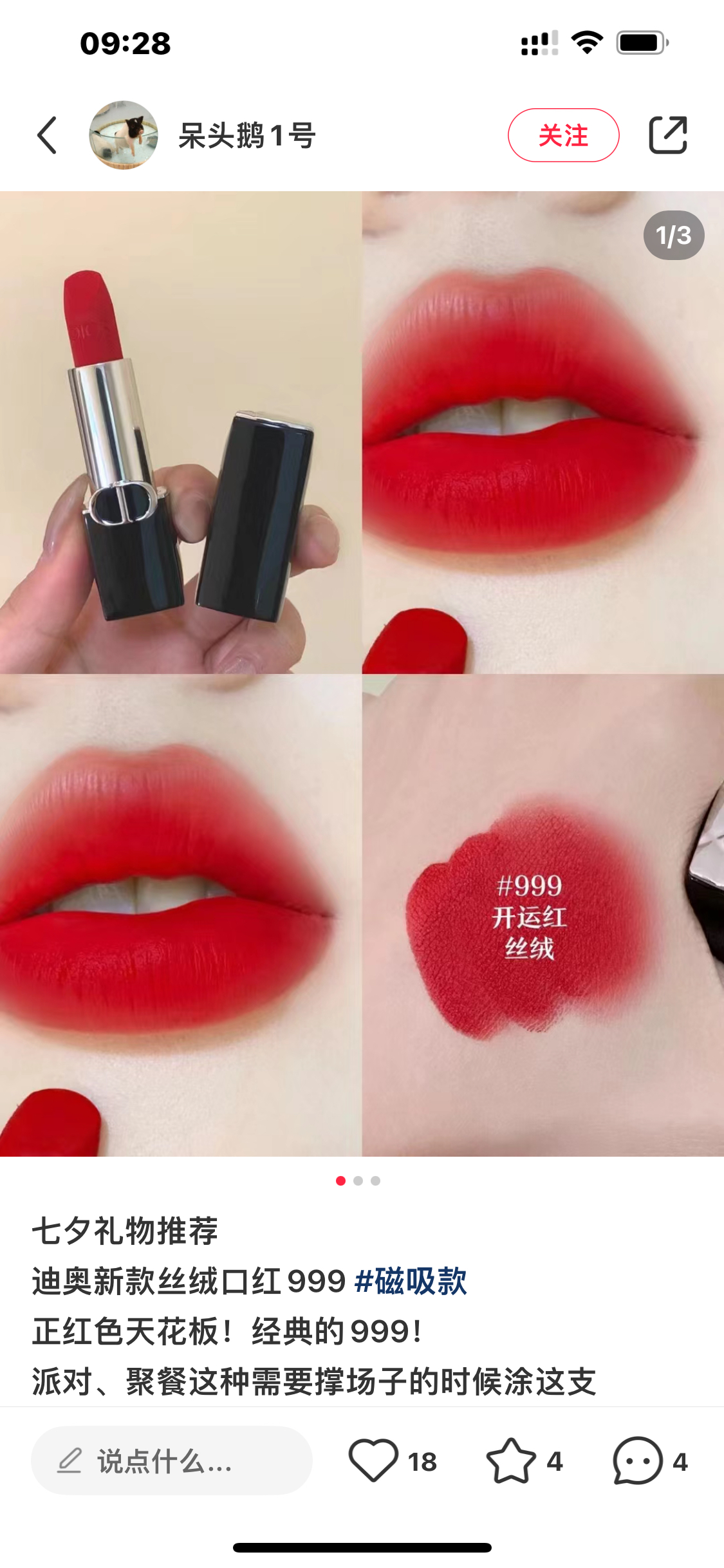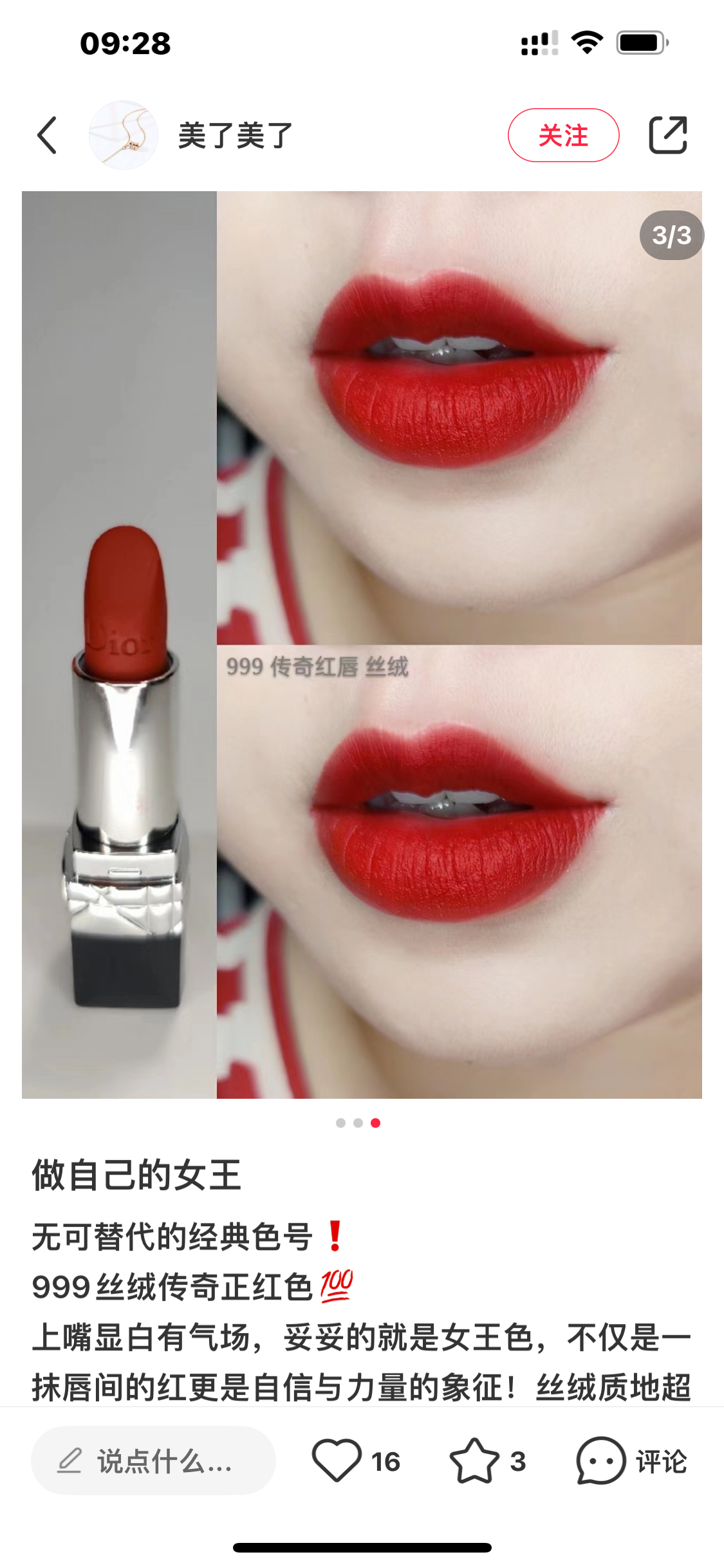 号称"幸运发财色",相比迪奥最火的999来说会更偏橘一点,薄涂日常很,对黄皮也很友好哦~说一下上嘴的感觉,这只是哑光质地,不用唇膏打底直接上嘴也不拔干!总体来说颜色、质地都很不错的一只,可以放心入,不会踩雷的颜色,如果纠结999和888,平时不化妆的话,我比较推荐888,个人感觉偏橘会更日常一些,也更适合黄皮的小仙女一点哟~