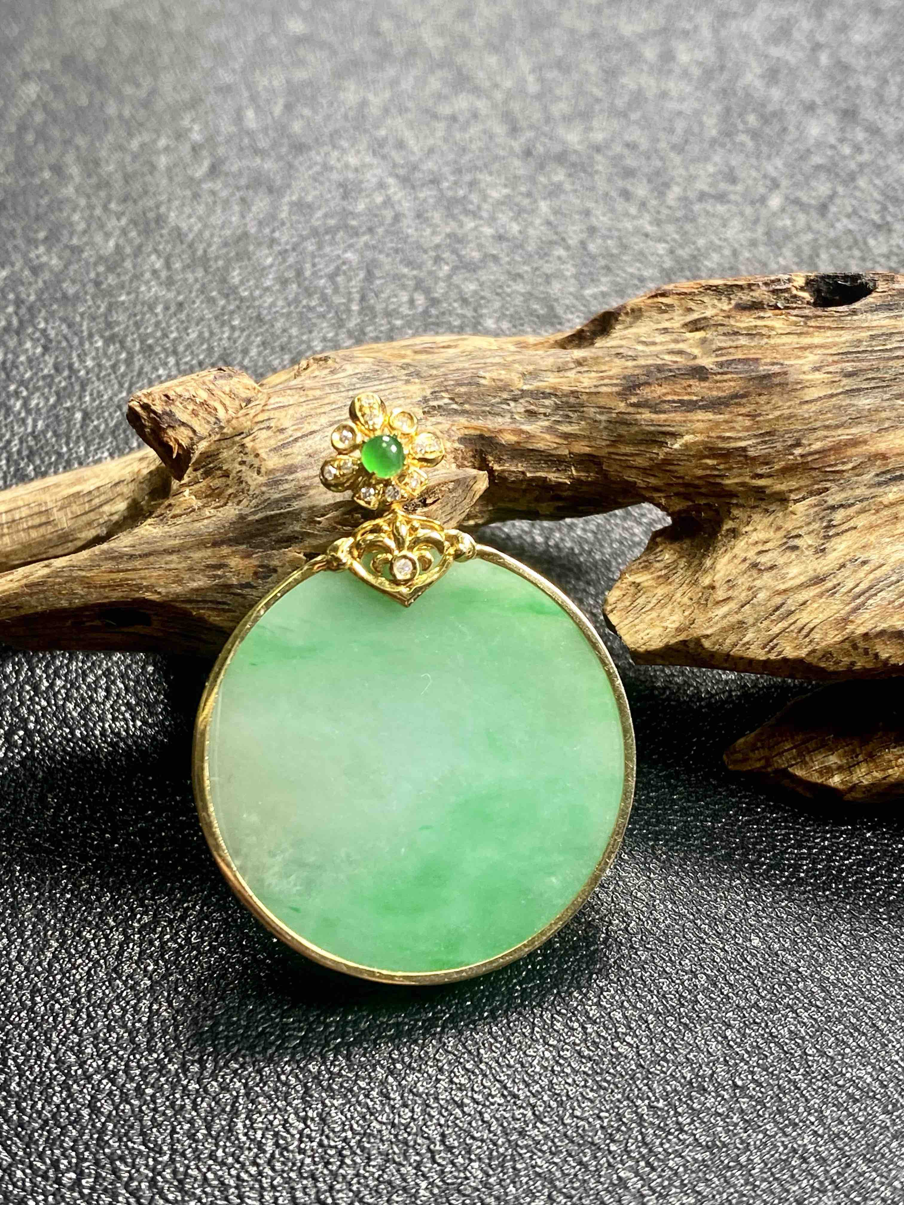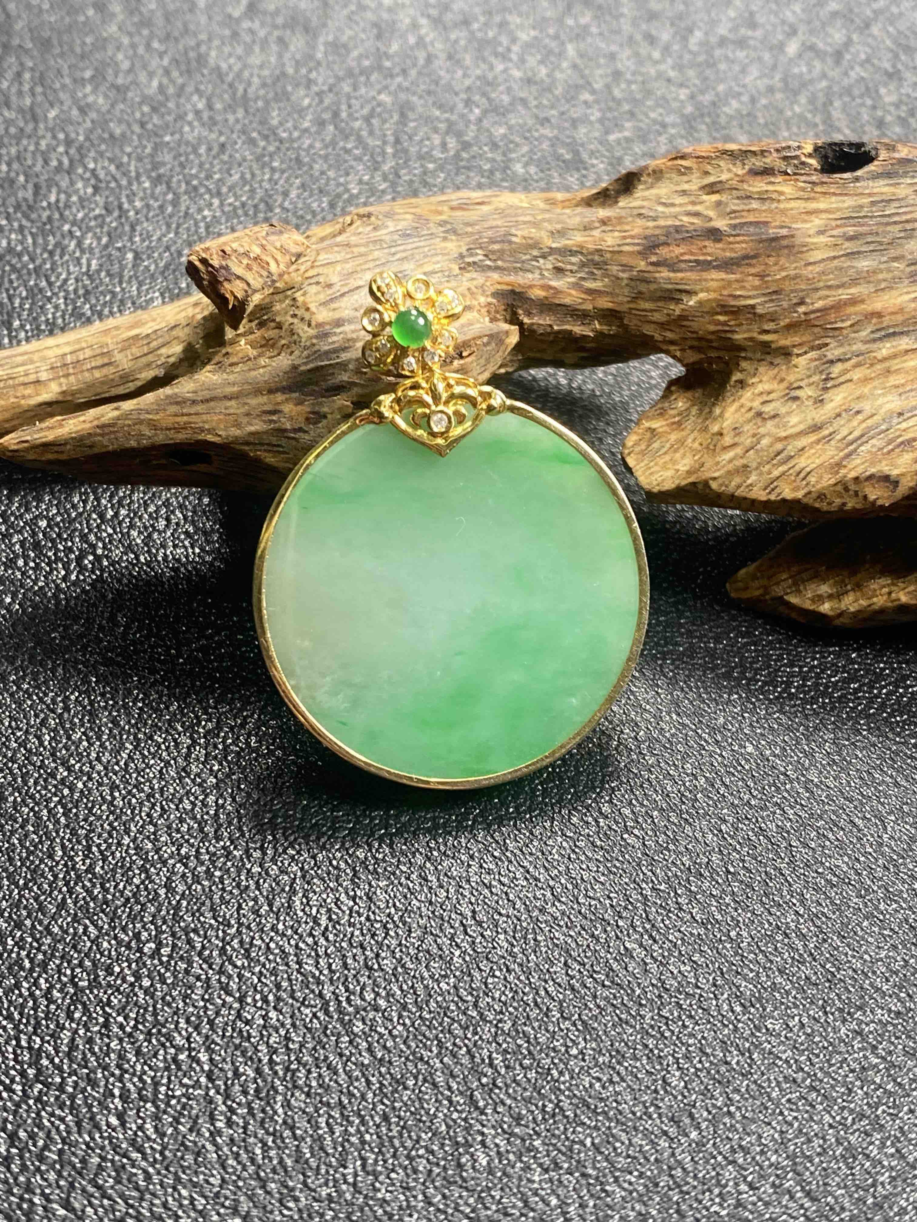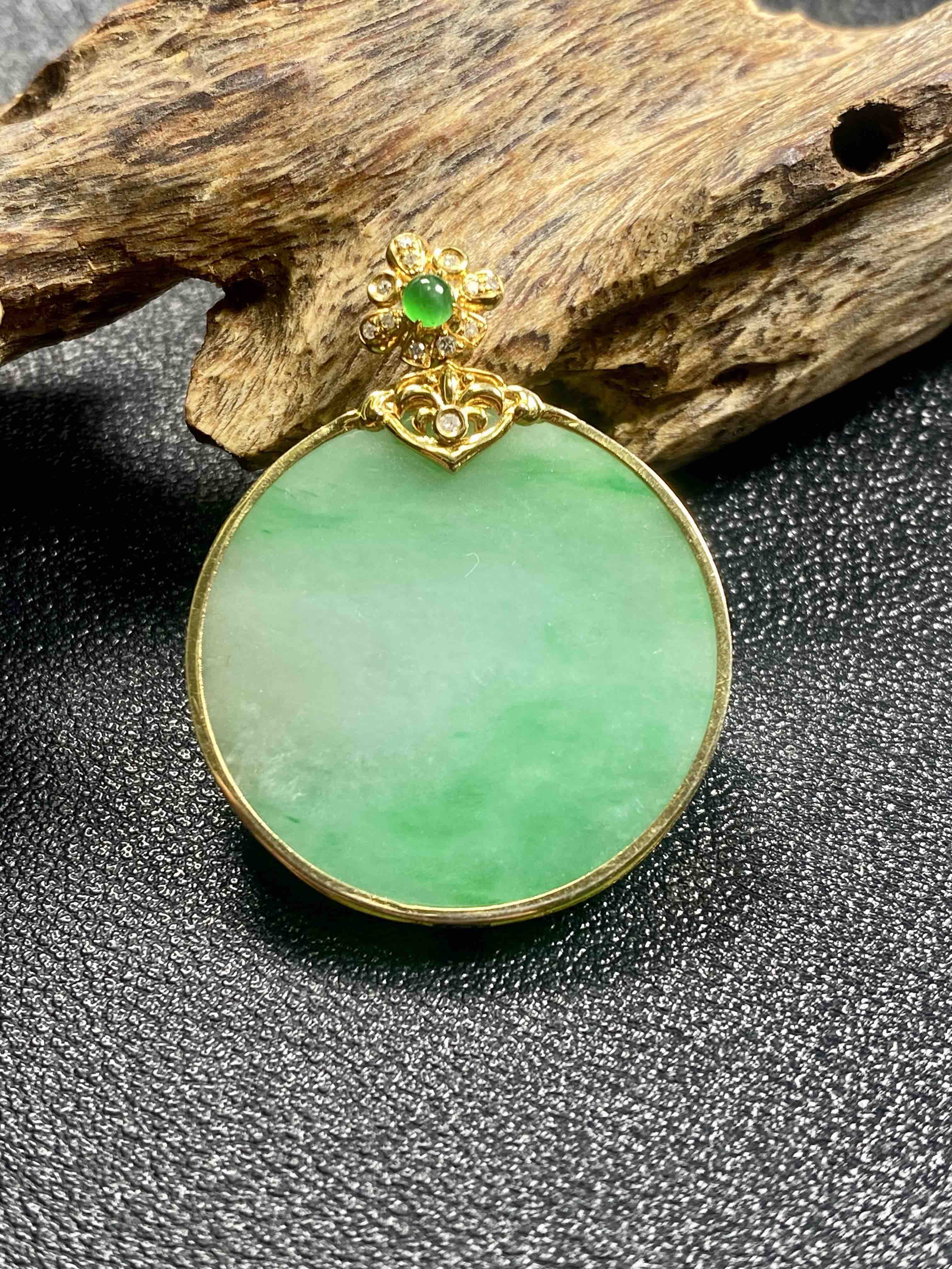 【FC0110】18K镶嵌翡翠冰飘绿圆牌吊坠 冰润细腻 色泽亮丽 圆圆满满