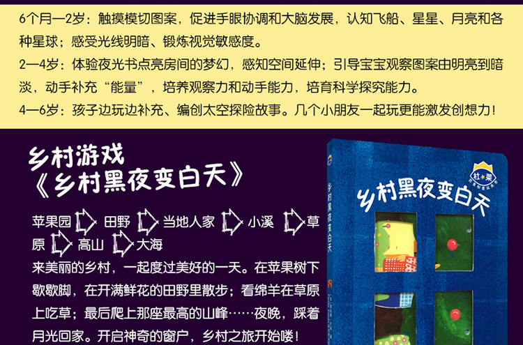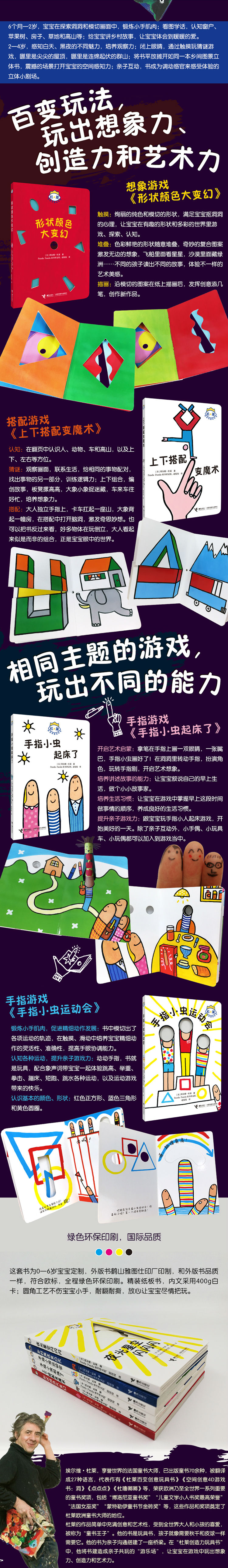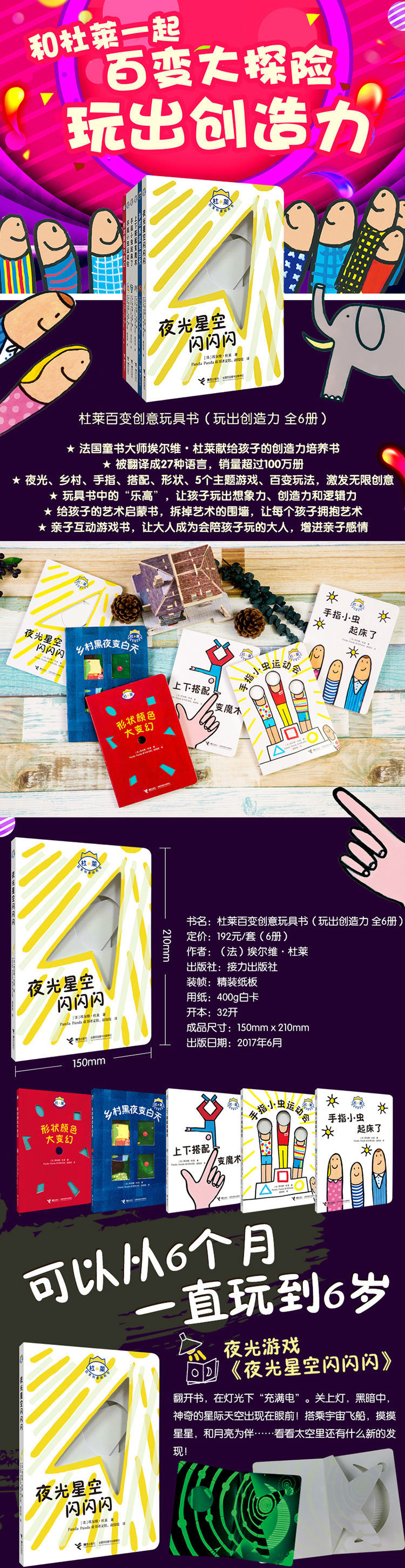 “杜莱百变创意玩具书”是一套艺术玩具书,本系列书包括《夜光星空闪闪闪》《乡村黑夜变白天》《手指小虫运动会》《手指小虫起床了》《上下搭配变魔术》《形状颜色大变幻》六册。在不同的主题中,杜莱运用点、线、面的涂鸦,光线、空间、造型的多维设计,实现了将读者既有经验、感受完全打破、重新组合的阅读体验——在这里,有在黑暗中可以看到星际天空的夜光书;有让孩子感知白天和黑夜的不同的乡村游戏;有转动手指、扮演角色开始美好一天的手指小虫早安游戏;有锻炼宝宝小手肌肉,满足扣洞洞心理的手指小虫运动游戏;有可以产生几十种组合的翻览游戏,还有探索形状、颜色、线条之间的美感关系的猜谜游戏,每本书的阅读、把玩过程,都像是一次想象力、创造力大挑战,启发读者在创意中制造创意。