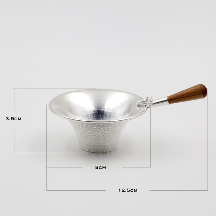 寸大师的银器,采用国标1号纯银(即999纯银)。银器全部由寸发标大师亲制,除茶漏以外其余作品都打有大师印签,每件作品都有大师签名的收藏证书,每件产品只有1件现货。