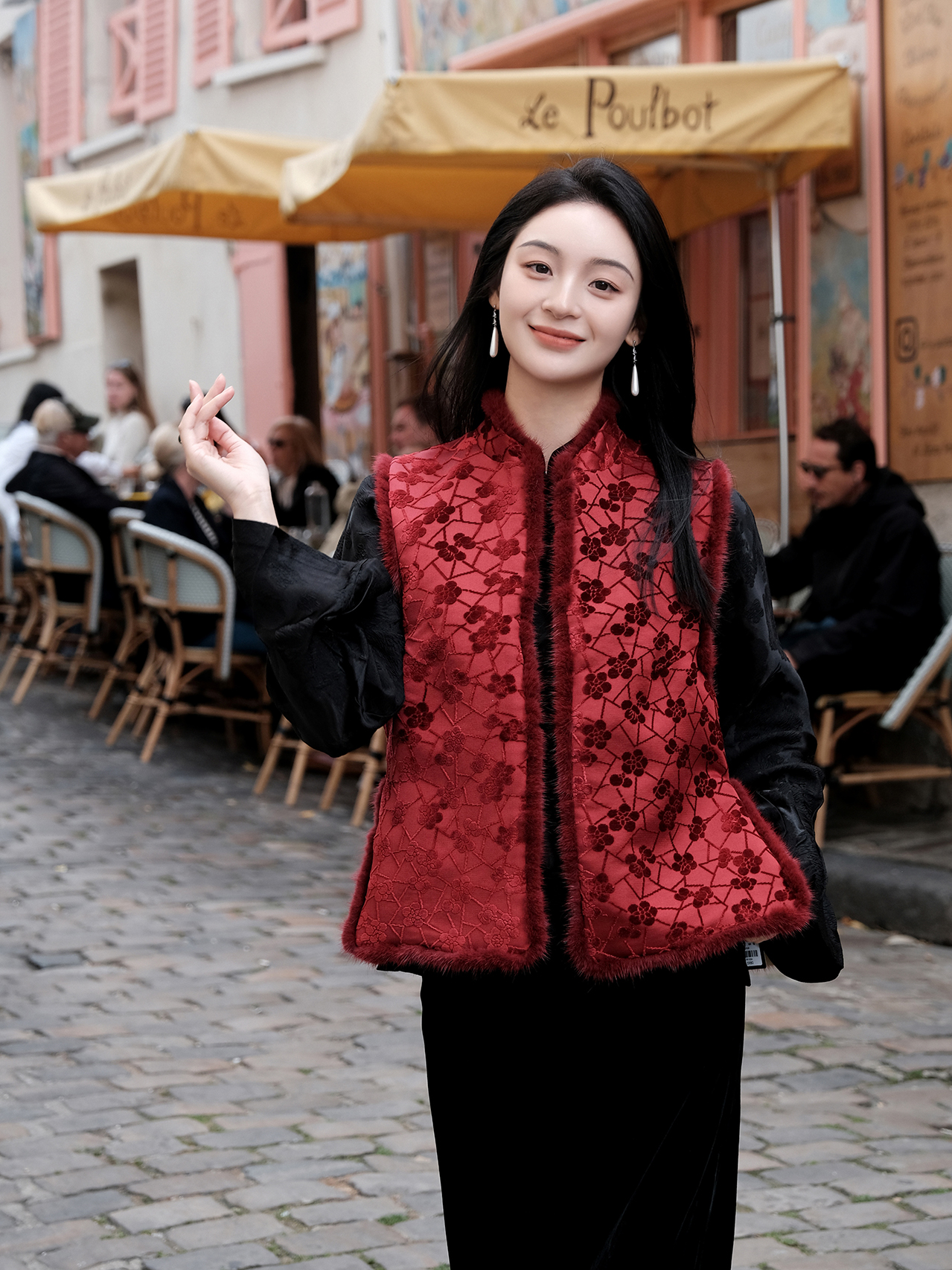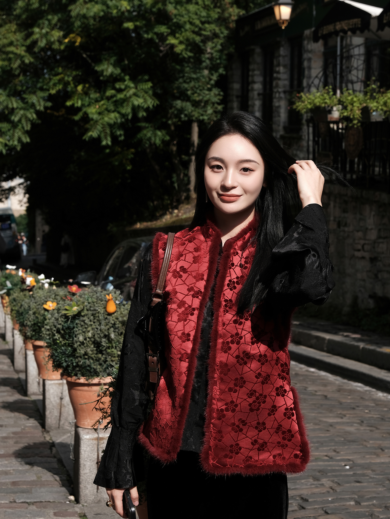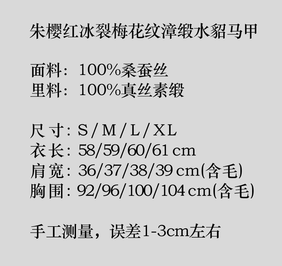 盛唐牡丹|朱樱红冰裂梅花纹漳缎水貂马甲