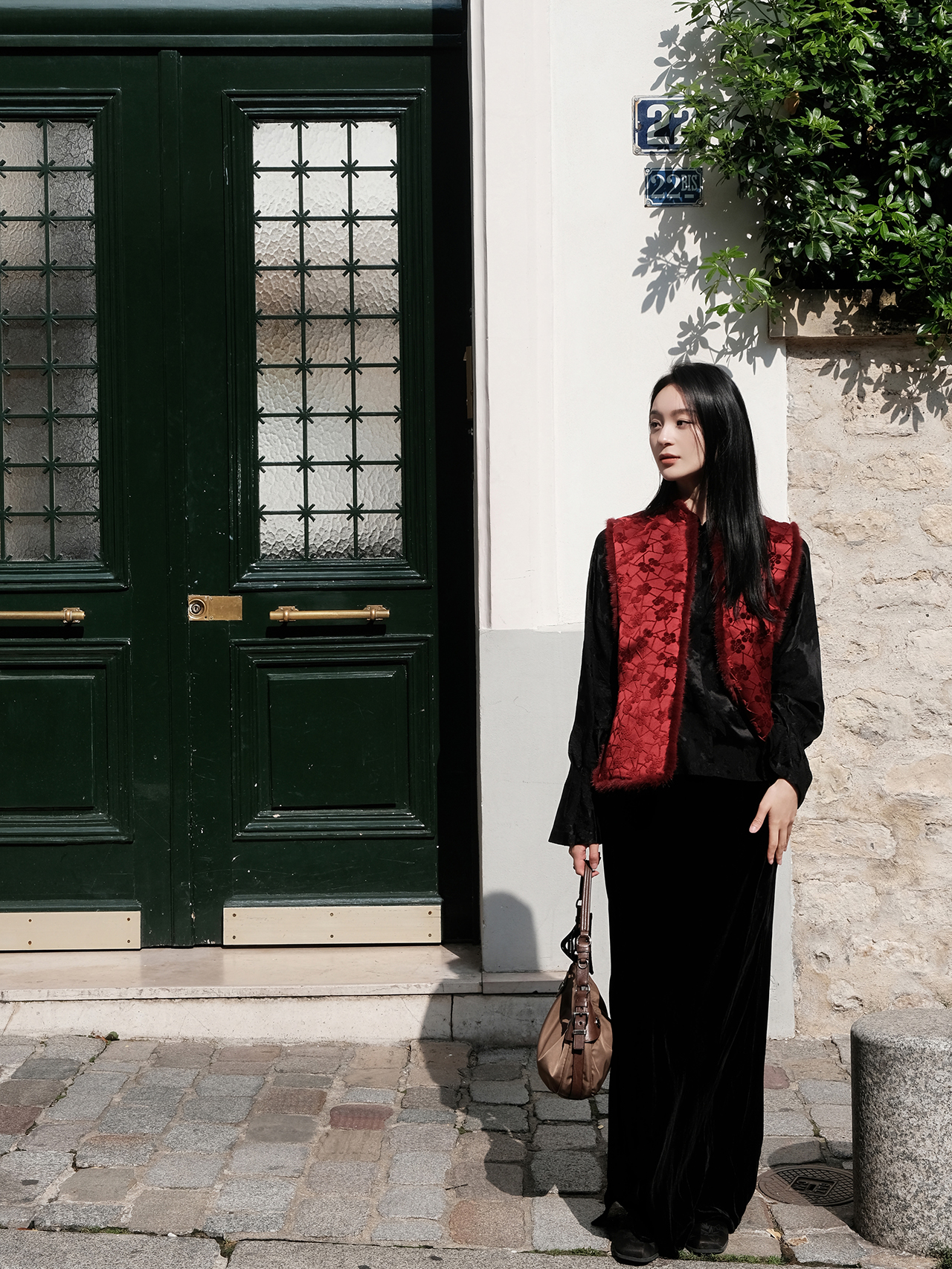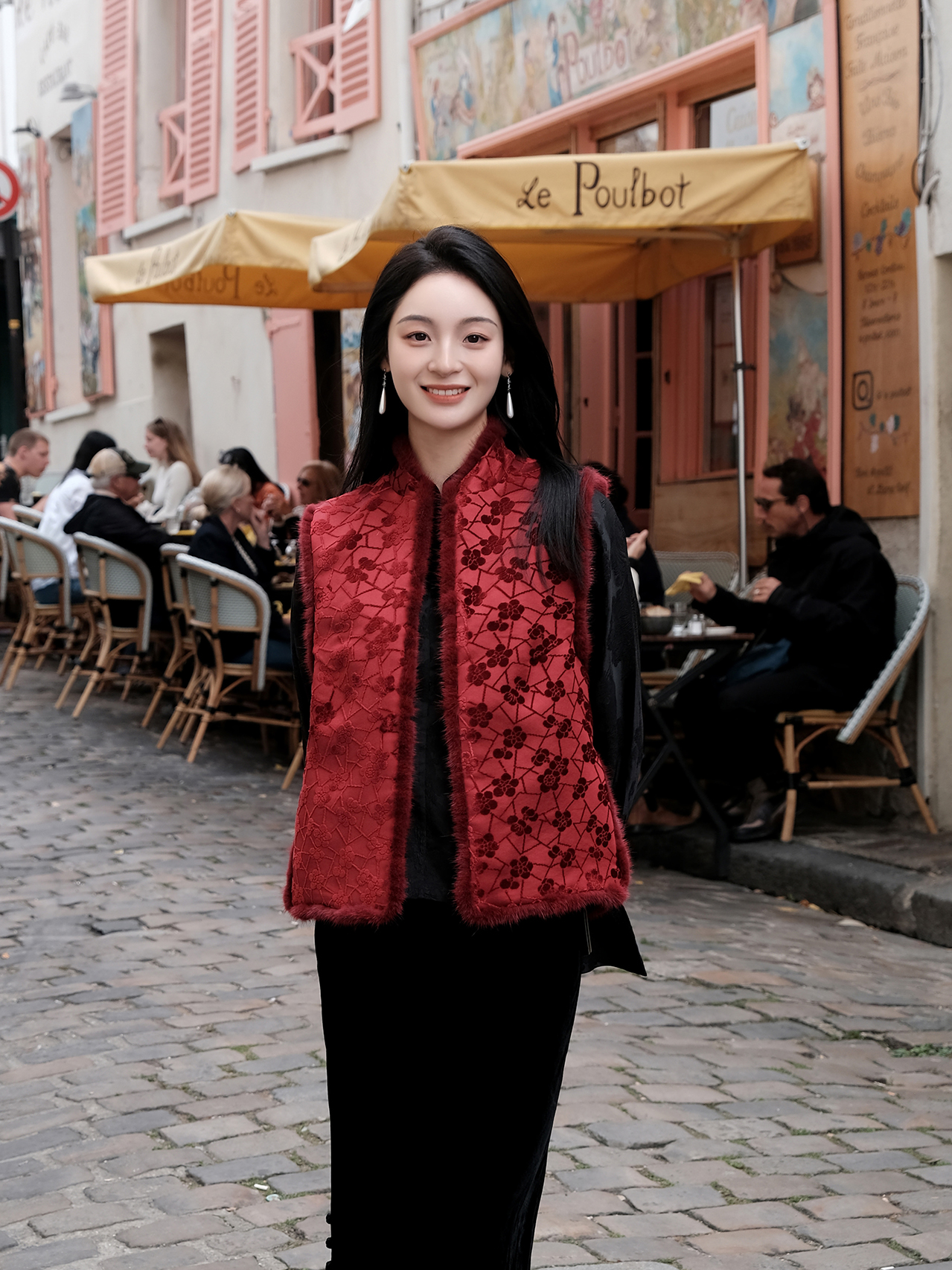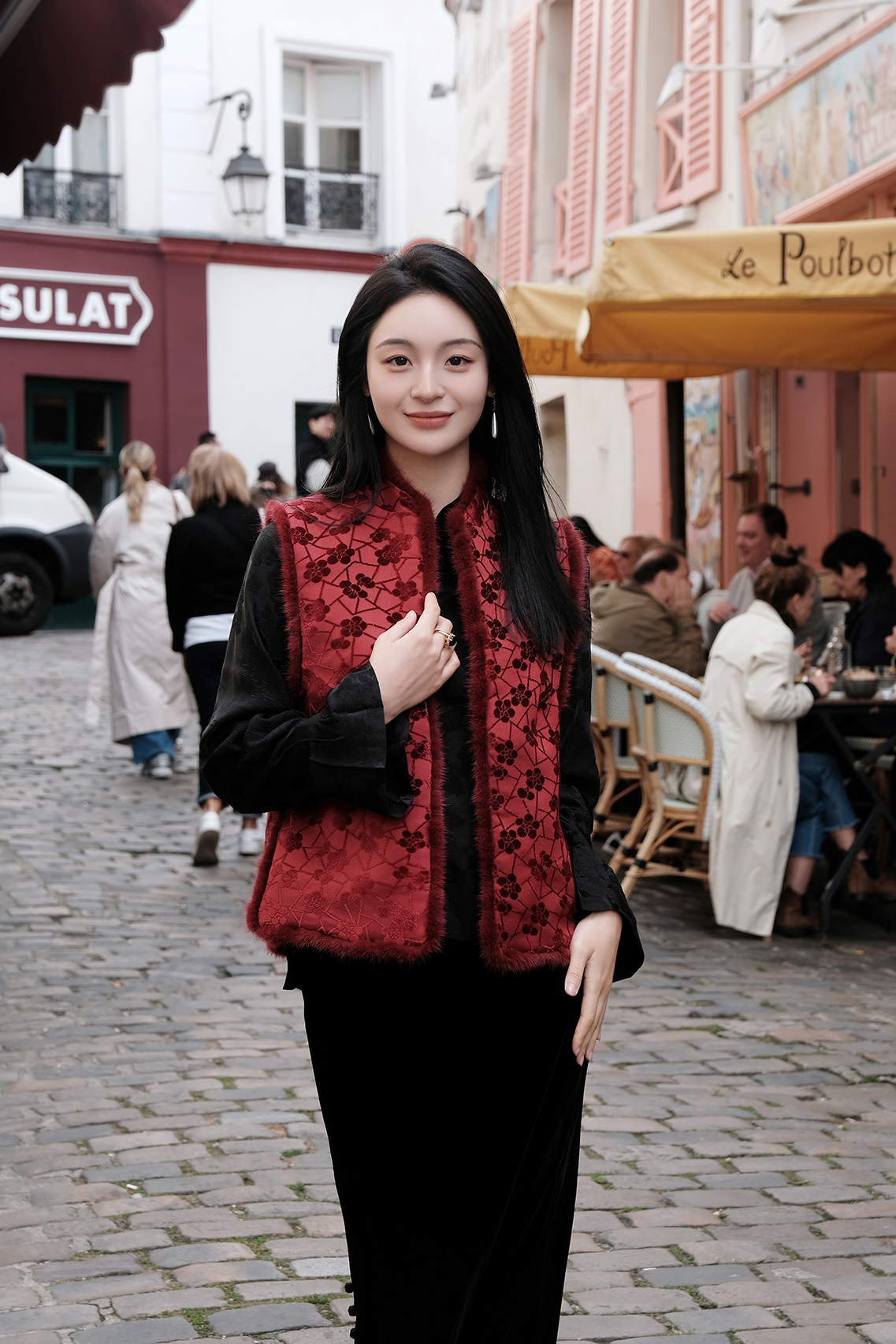 盛唐牡丹|朱樱红冰裂梅花纹漳缎水貂马甲