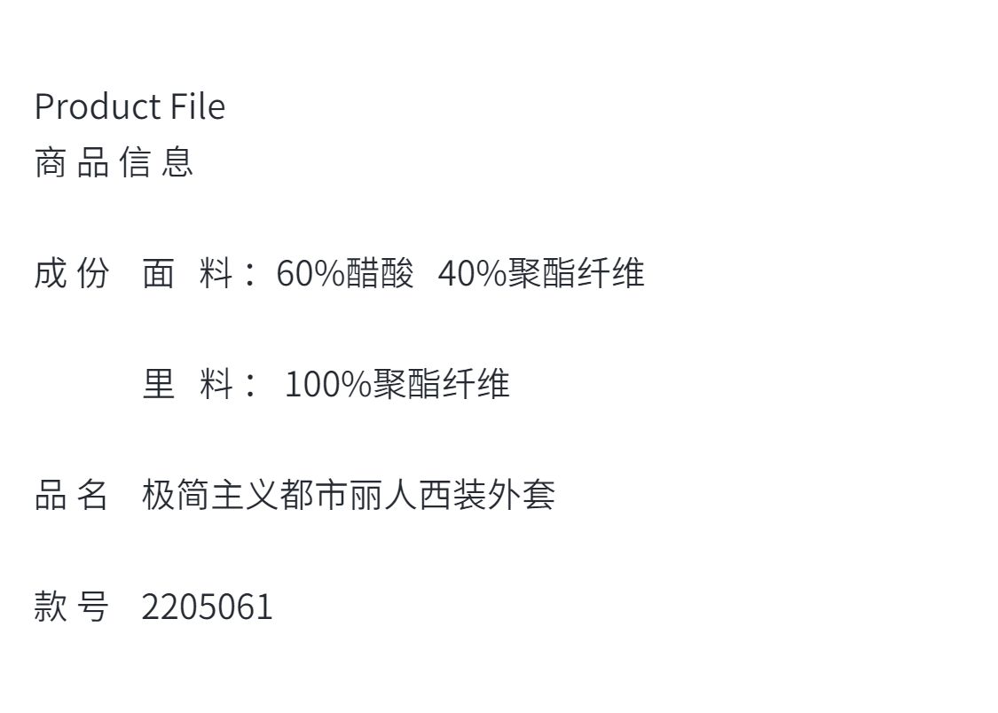 极简主义—生活艺术、通勤丽人简约西服外套、舒适醋酸面料2205061