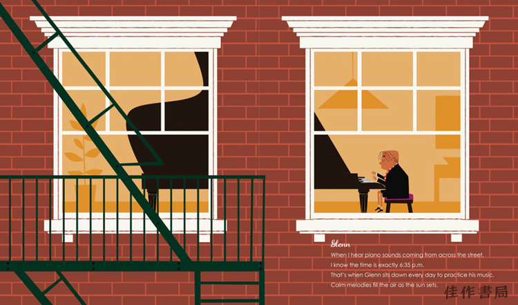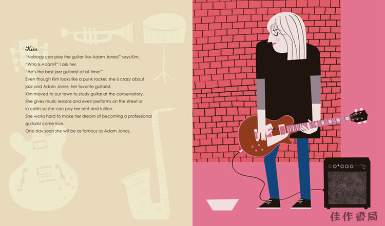 This smart and whimsical portrait of the inhabitants of a town reveals the joys of discovering what makes each person unique and extraordinary. Nico lives in a small coastal town, a place like any other, with ordinary neighbors and friends. But are they really ordinary? As Nico meanders through his town he introduces readers to his friends. There’s Josean, who works on the docks and who could be an Olympic rower. Peru recites all different kinds of poetry to his son. Nico’s best friend, Telmo, is a skateboarder with a wild imagination. Eva plays a mean jazz guitar and gives lessons so she can pay her rent and go to school. There’s Keiko, a potter; Dave, who is really tall; Sara, who owns a bookstore; Claud, a waiter whose real passion is astronomy. Each of these people, twenty-one in all, is depicted in charming, colorful drawings that celebrate quirkiness and individuality. This book encourages young readers to get to know the people around them and discover how everyone is different in their own wonderful way.