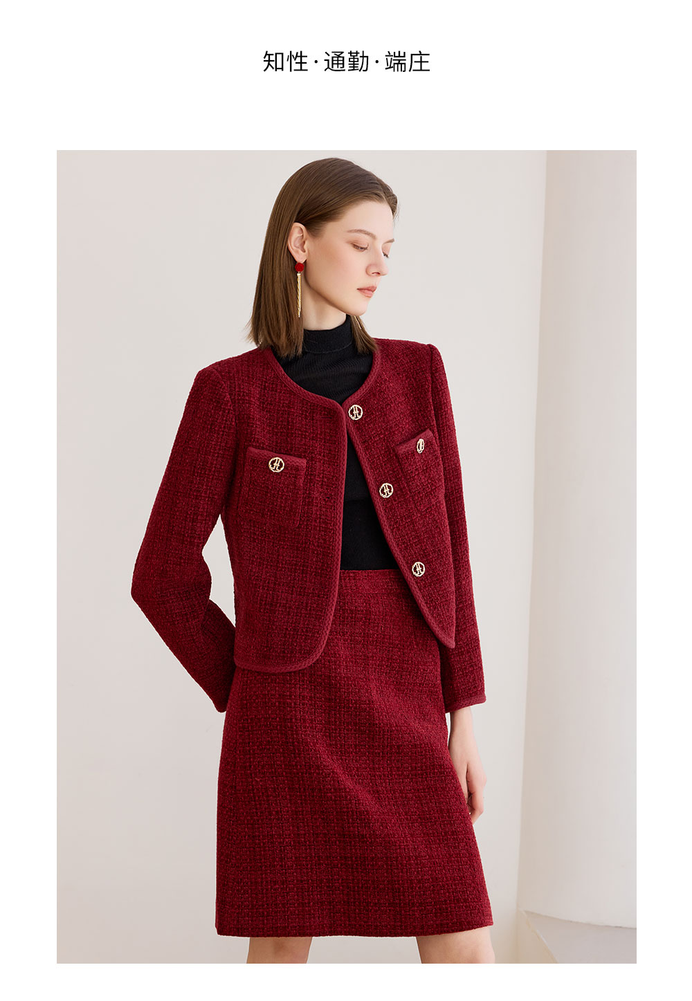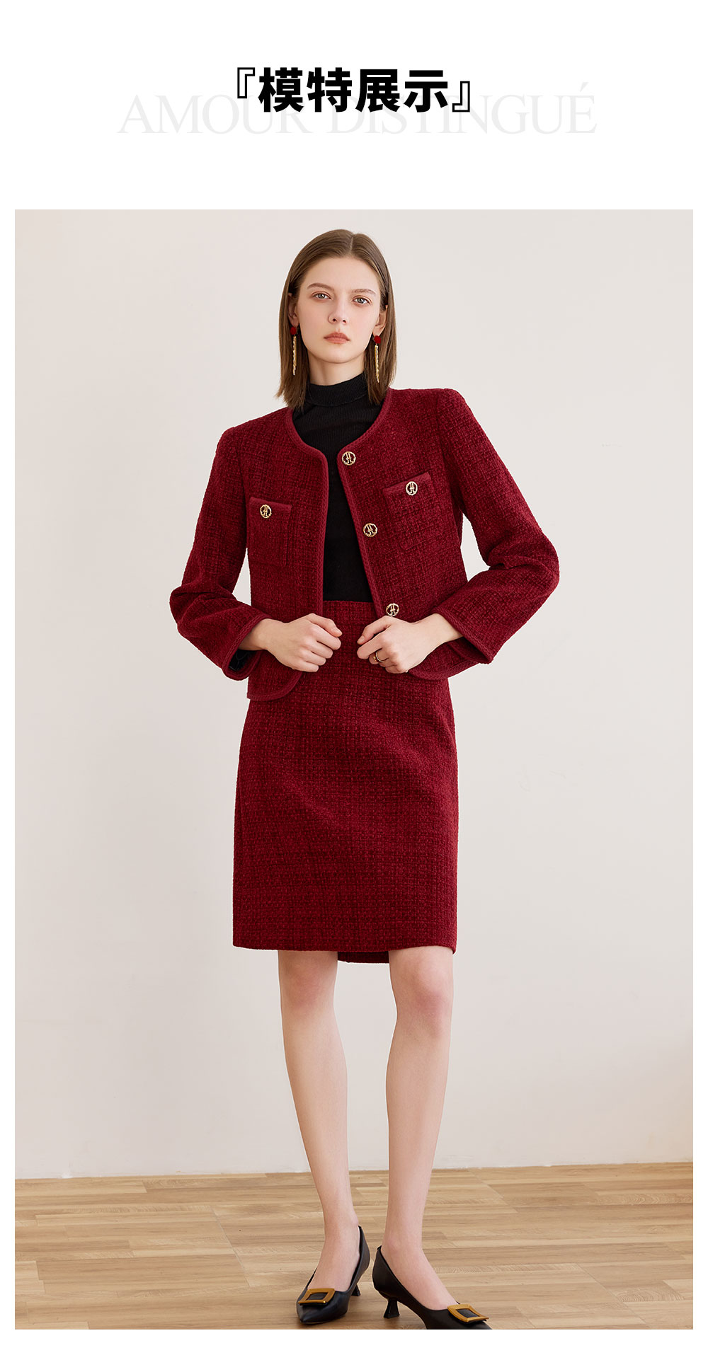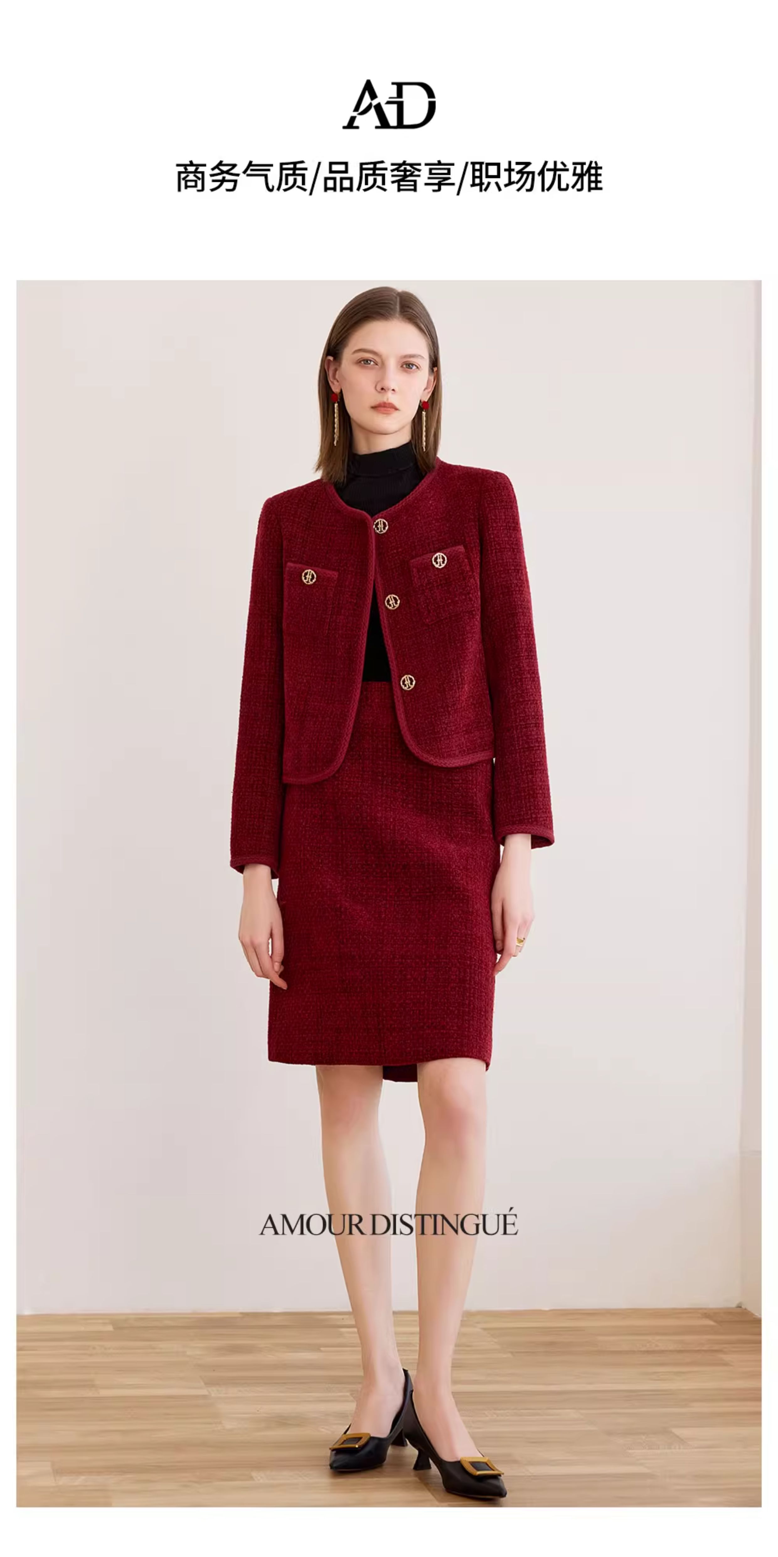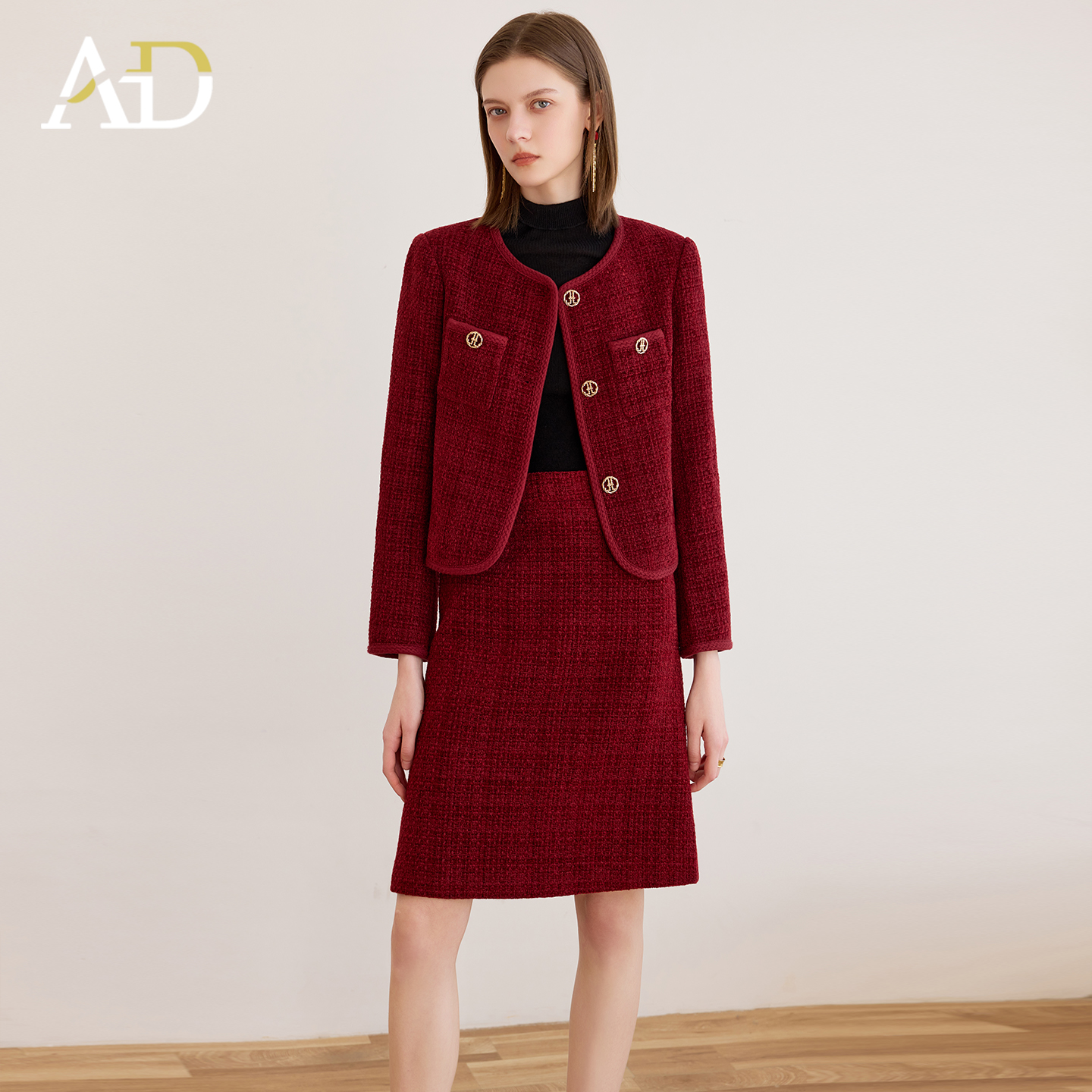AD法式肌理感红色小香风套装裙女秋冬时尚金属扣气质名媛外套约会