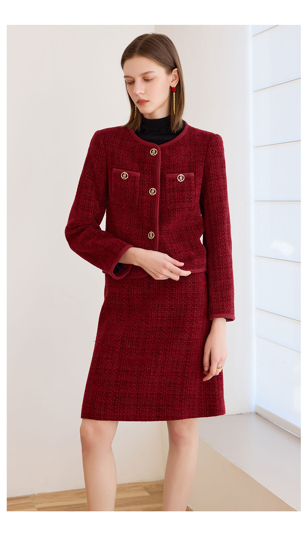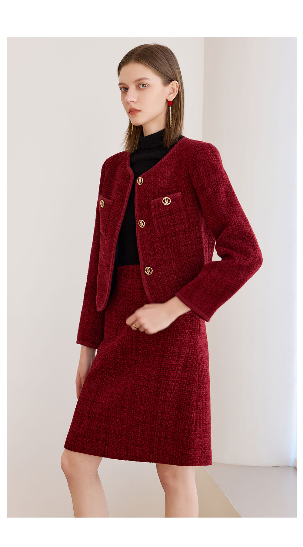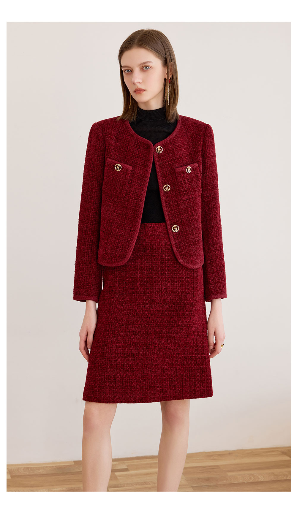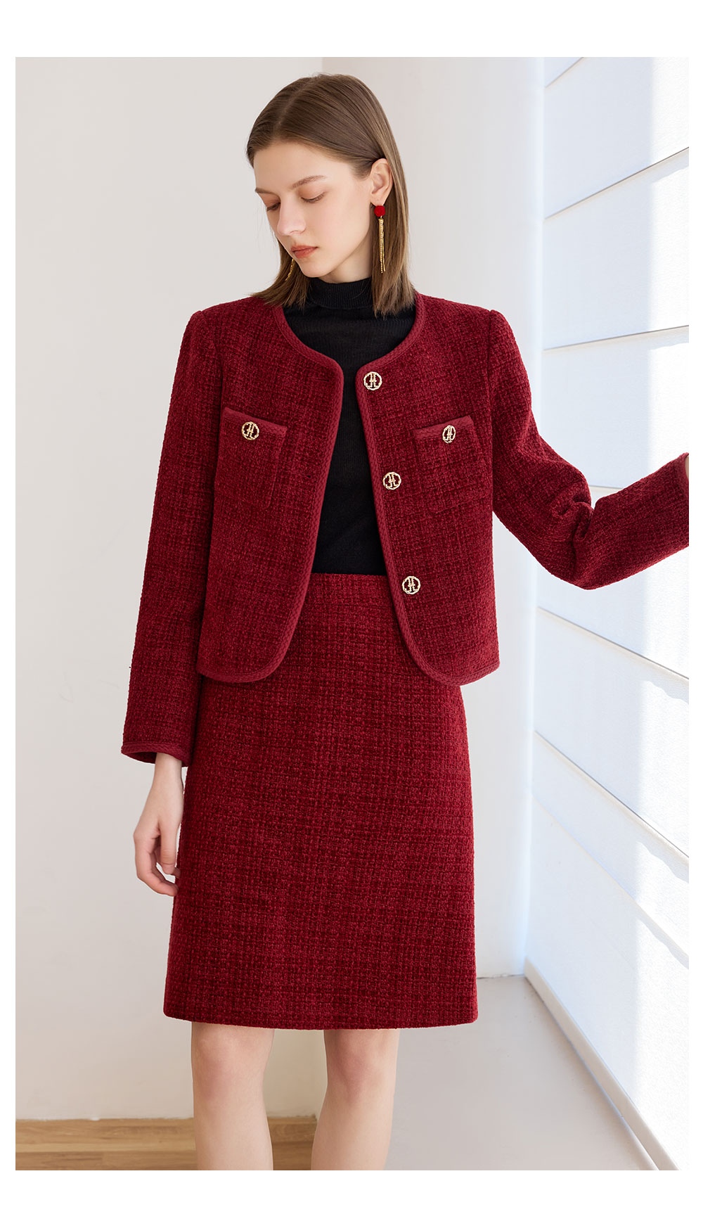 AD法式肌理感红色小香风套装裙女秋冬时尚金属扣气质名媛外套约会
