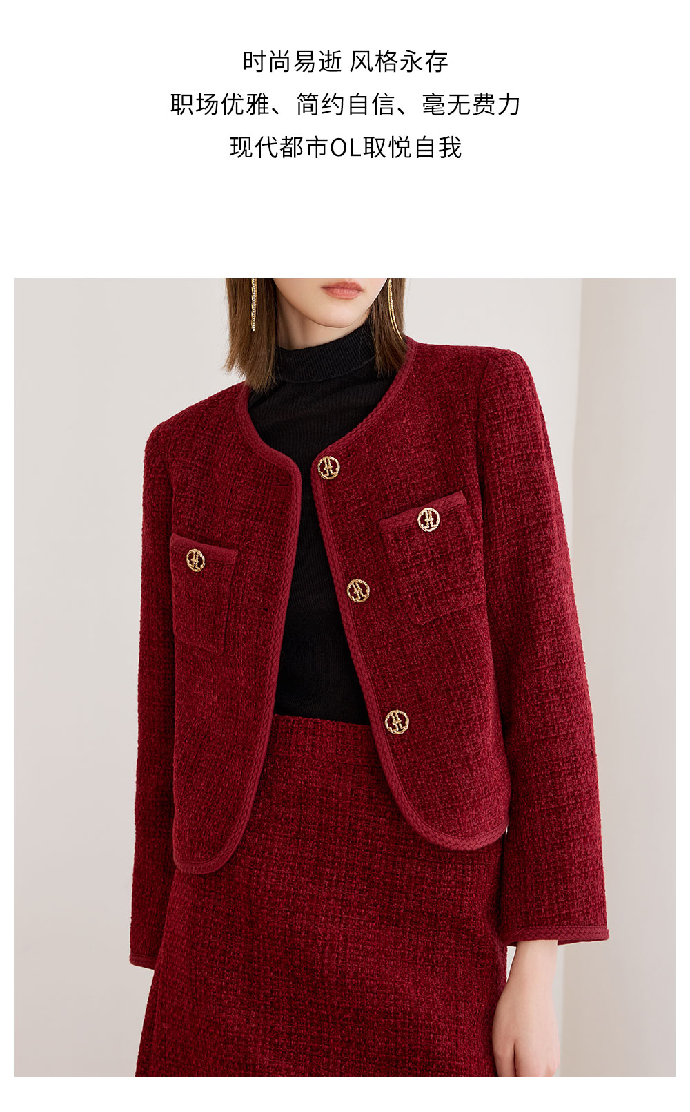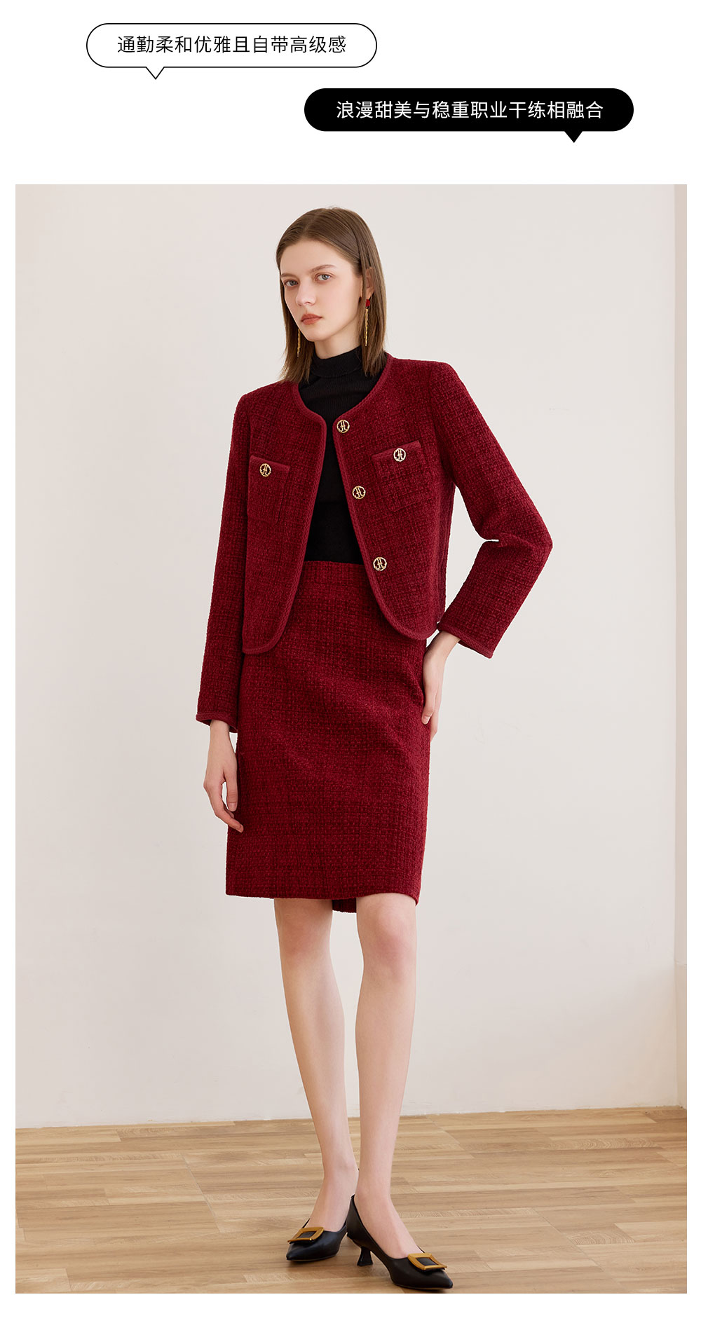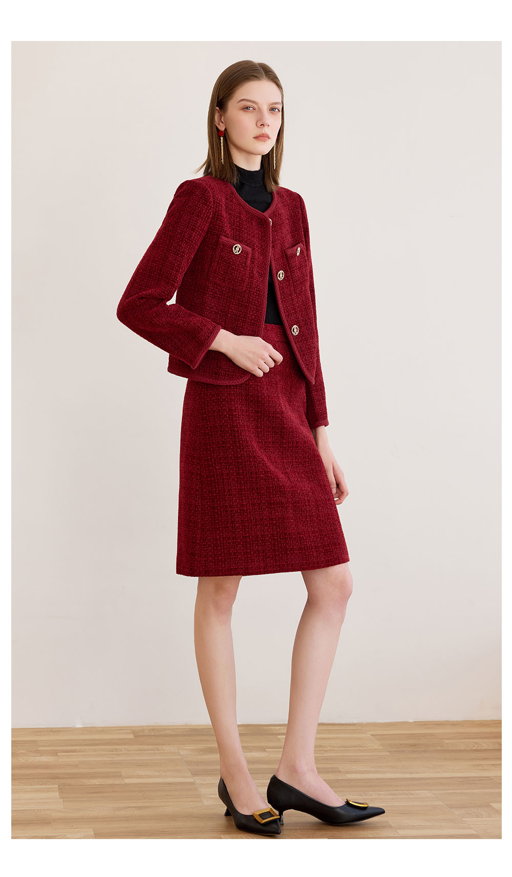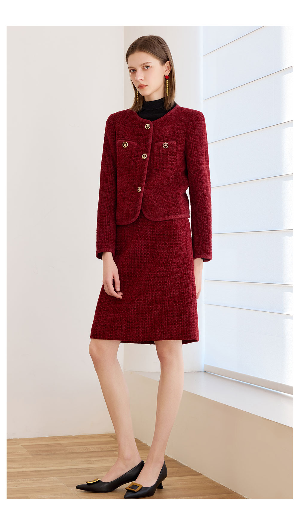 AD法式肌理感红色小香风套装裙女秋冬时尚金属扣气质名媛外套约会