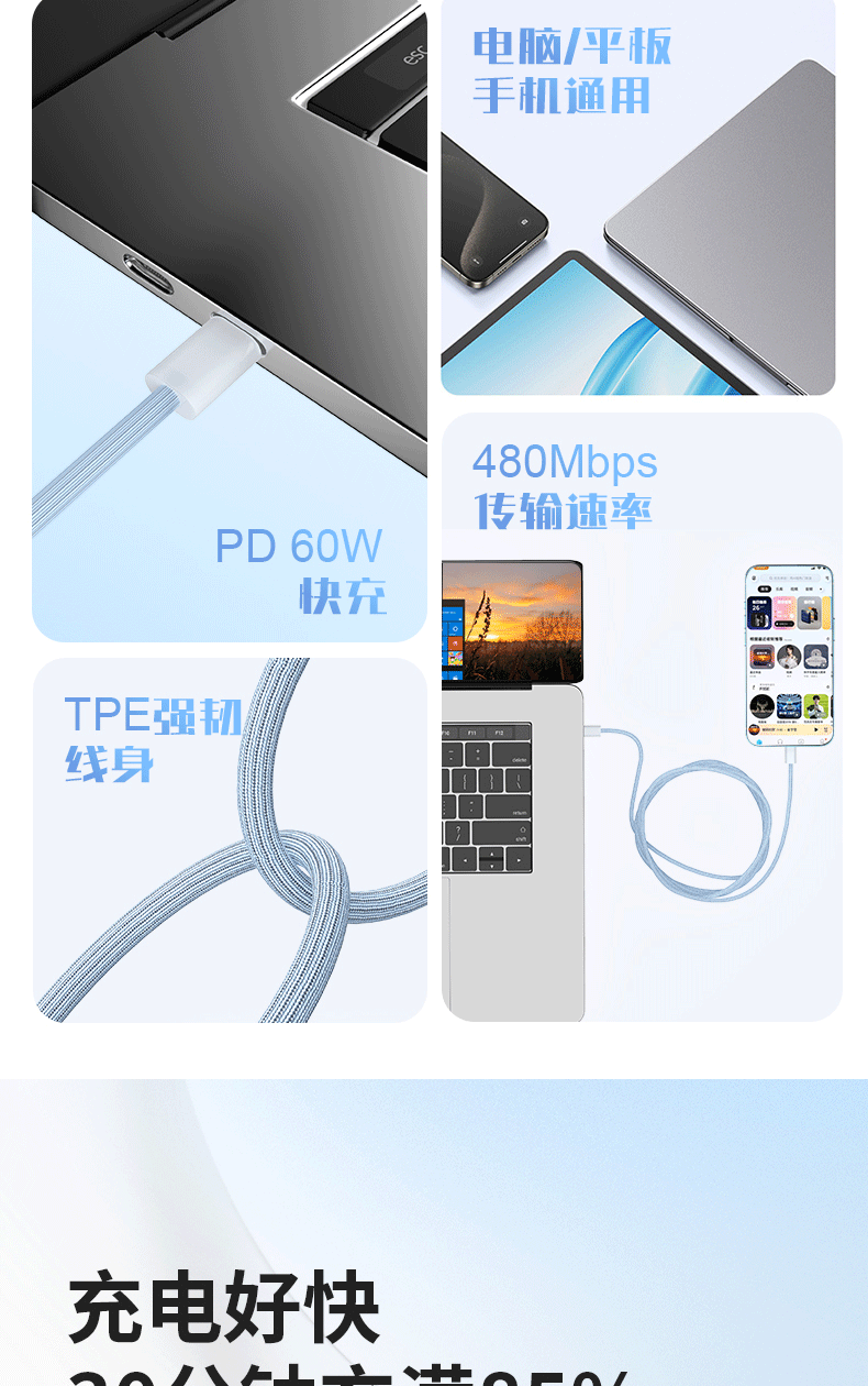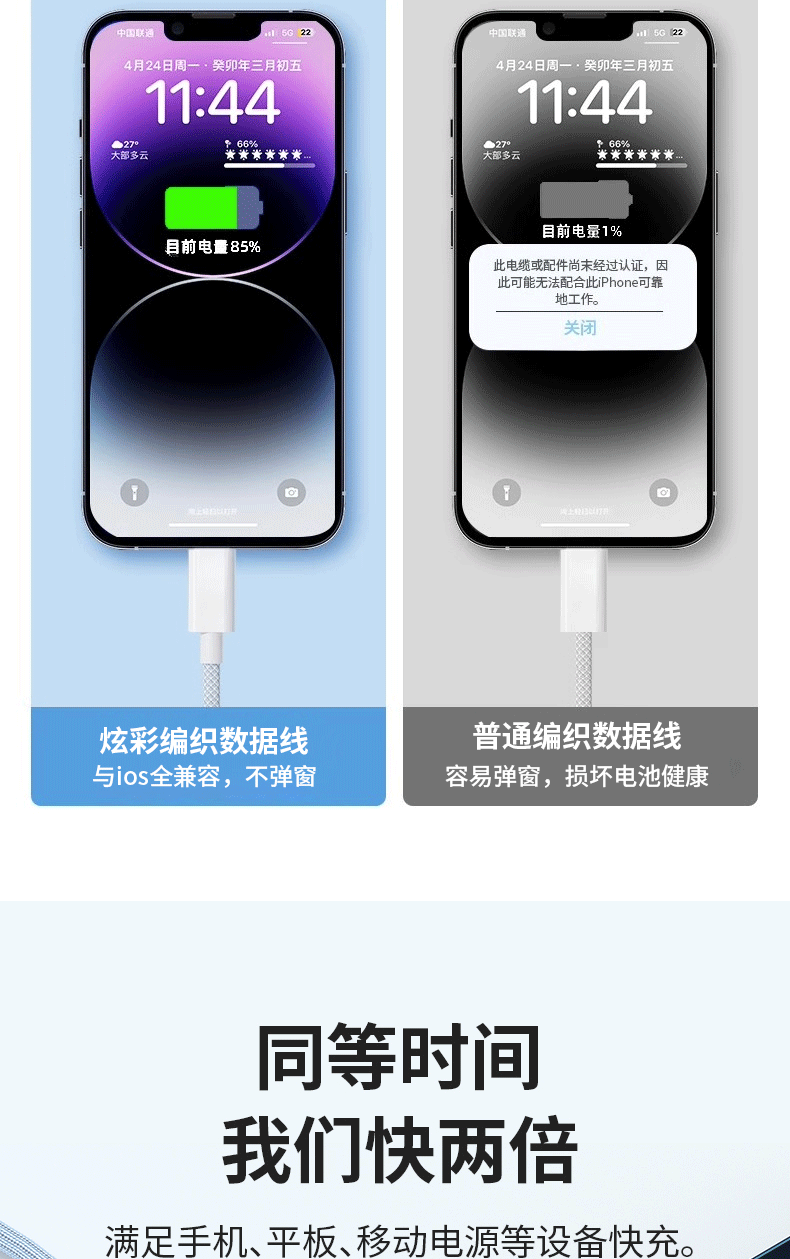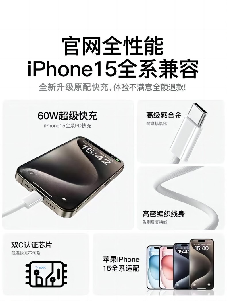 60W双C适用苹果15 尊贵黑色 数据线Type-C手机编织pd快充线华为充电线/盒