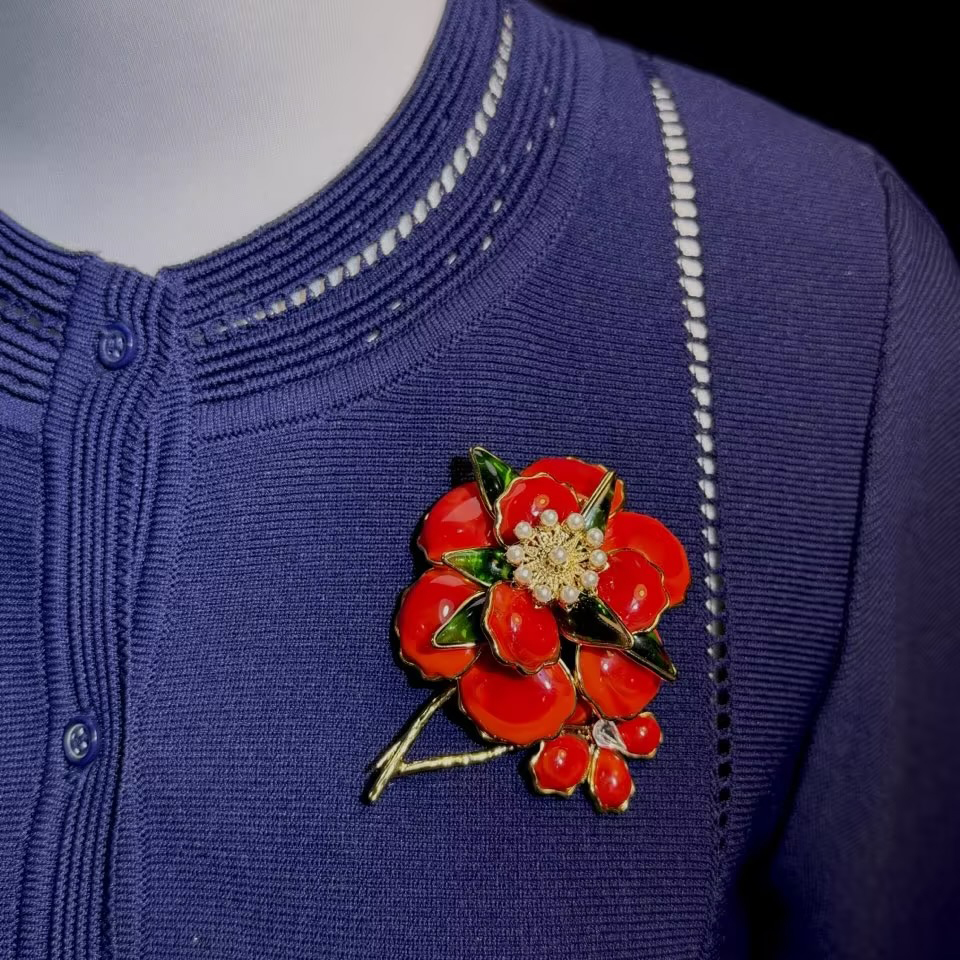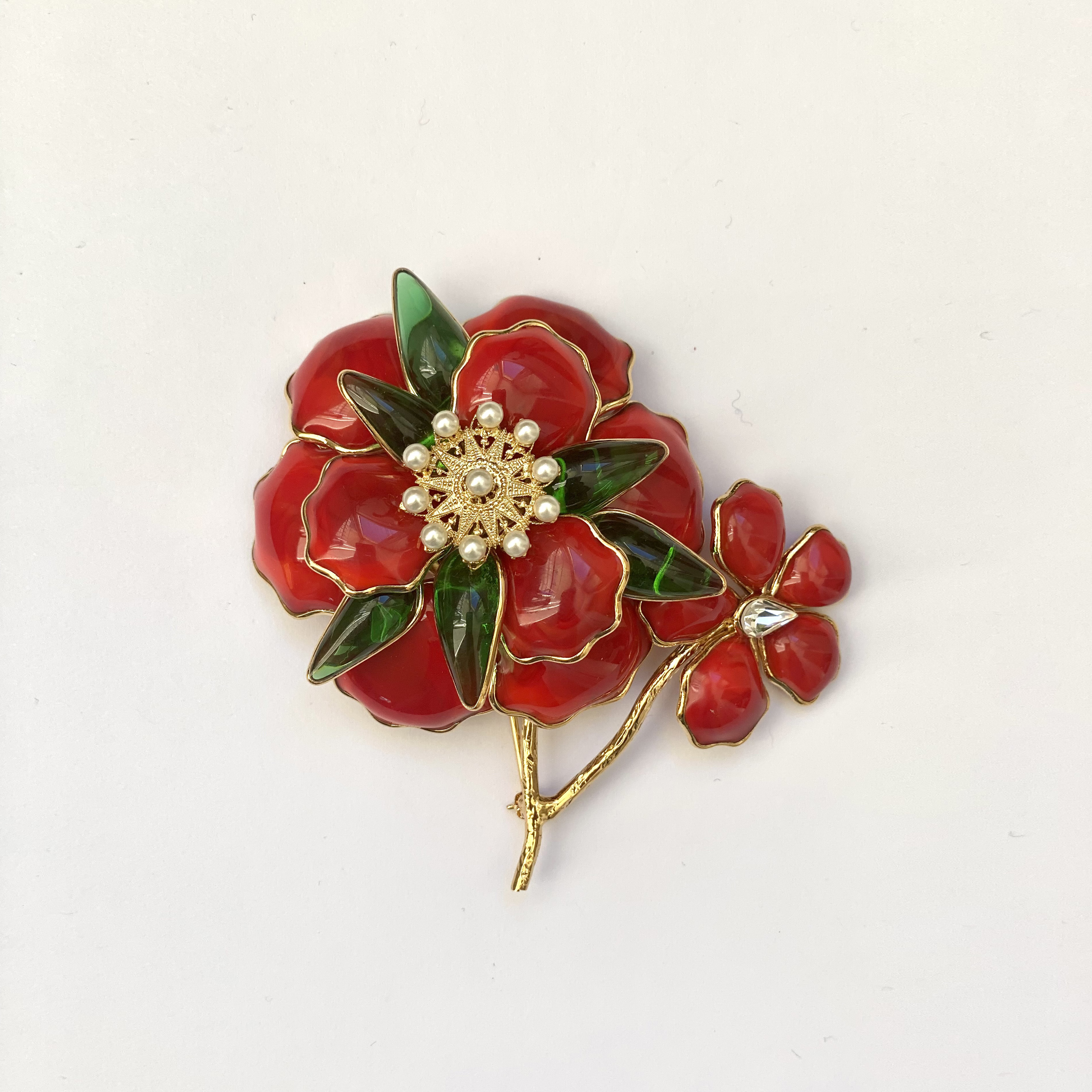 订购6个月到|Gripoix Paris-Vintage-Double Flower-复古 琉璃 胸针(红色)[法国设计师]