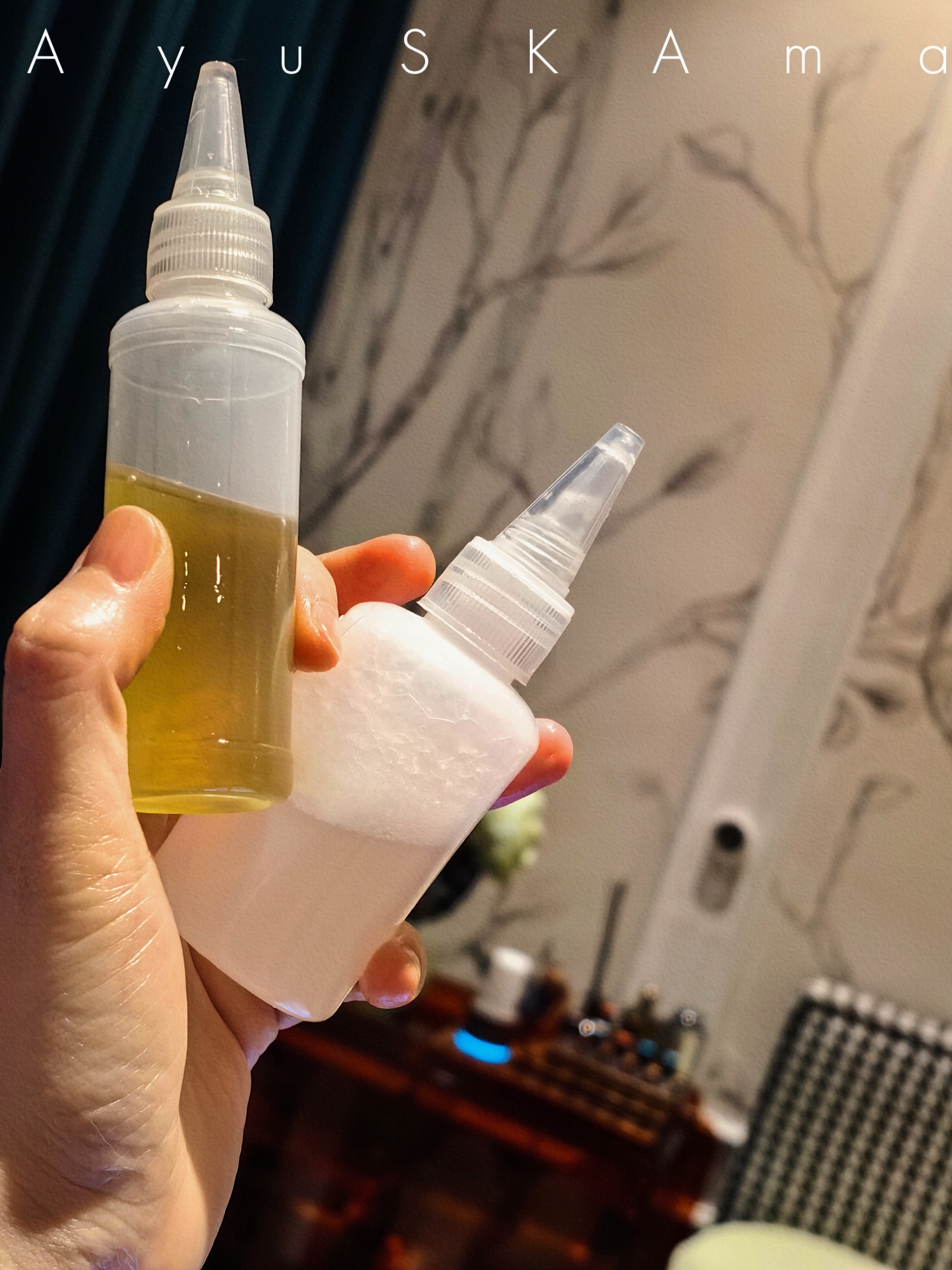 我的用法是:用尖嘴瓶把香蜂草檀香头皮护理油分装好,涂满整个头皮,按摩一下,戴上一次性浴帽10-20分钟,再把Ayu洗发水+迷迭香精露混合1:1混合,像在理发店一样干洗揉搓,直到完全乳化,之后再加洗发水洗两遍,冲得干干净净后,包上干发帽,最后散开自然干。
