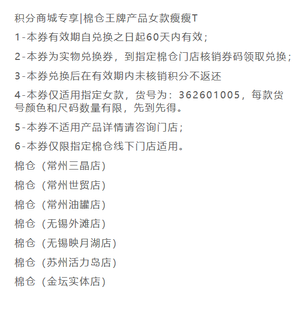 积分兑换专享|棉仓特产王牌产品·女款瘦瘦T(需到门店兑换)