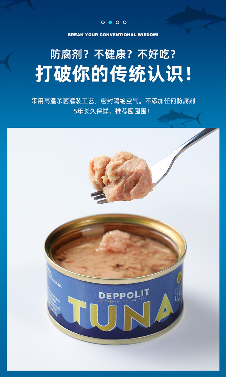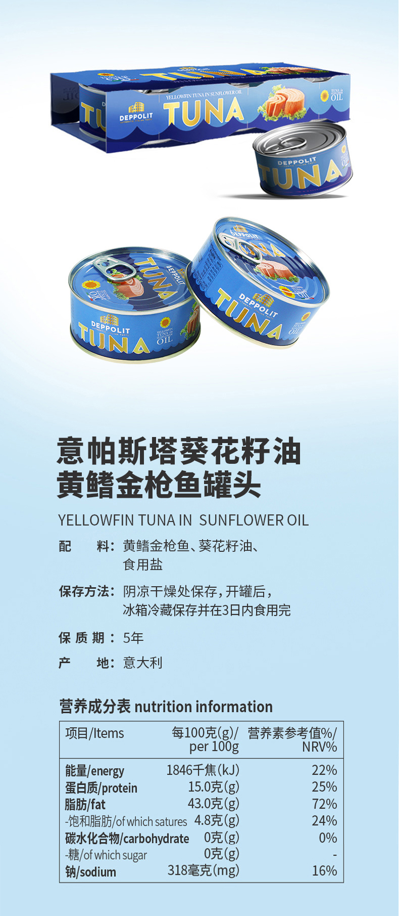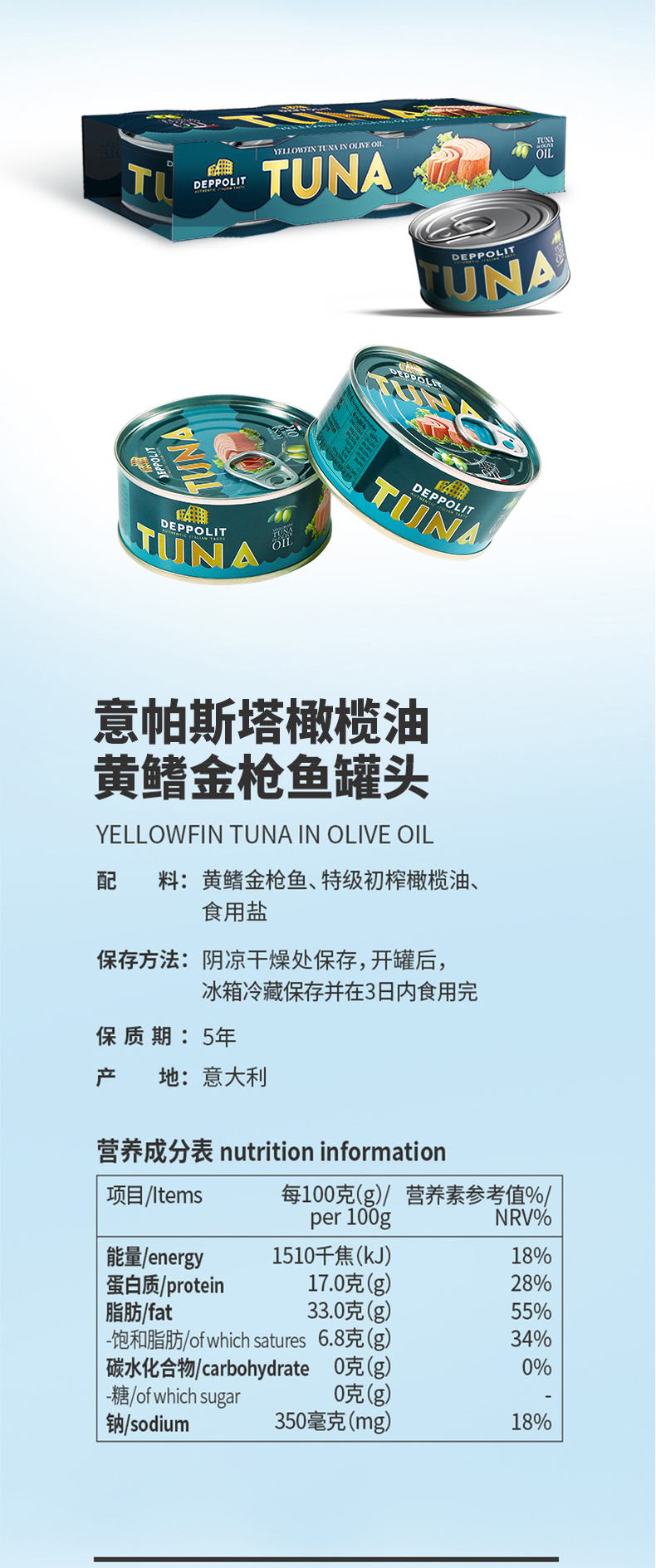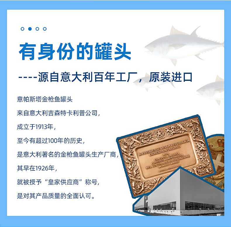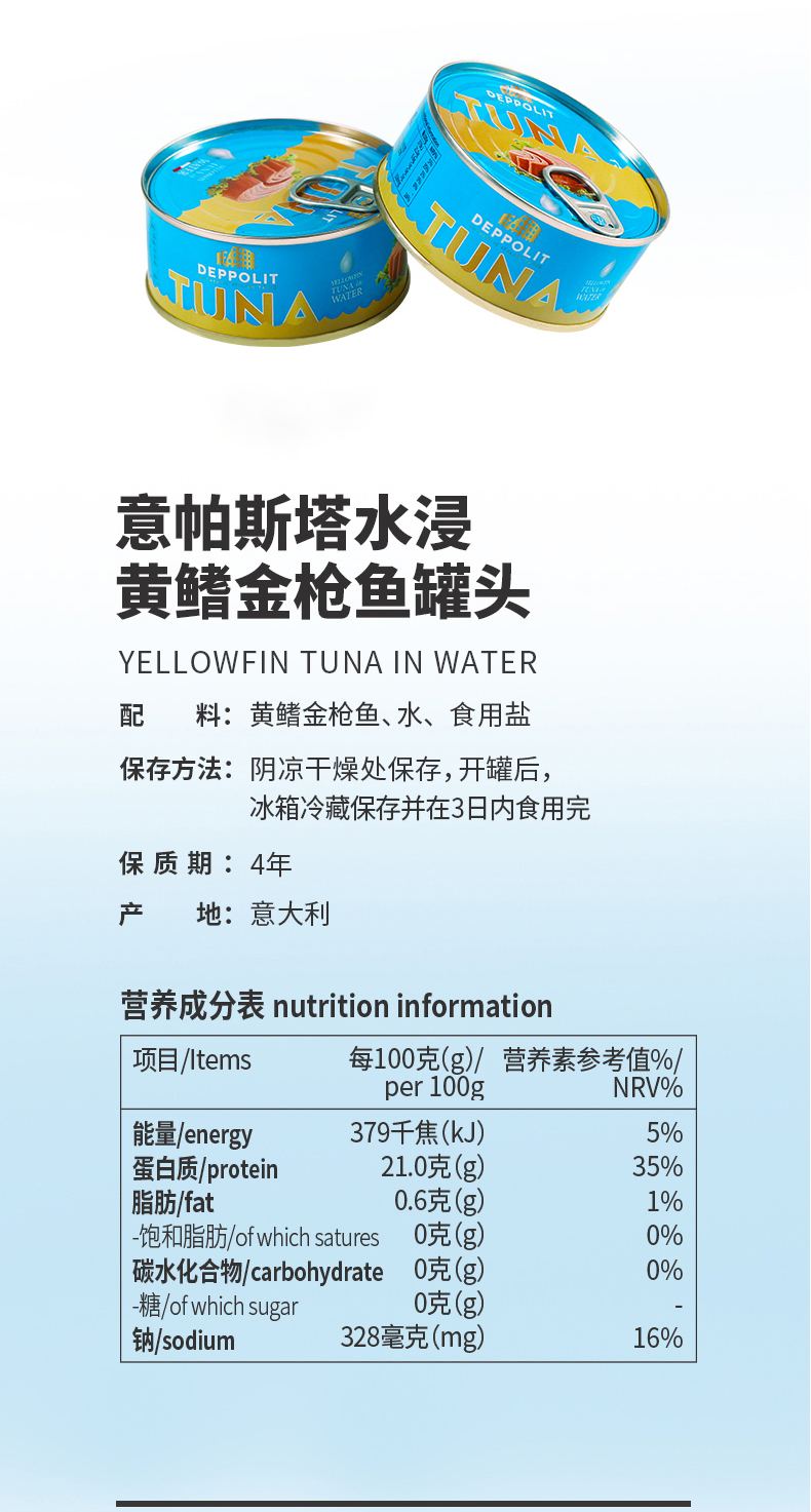 金枪鱼罐头多数是用的鲣鱼,口感不够细腻,还有腥味,所以很多人可能试过一次就不会再想吃了。但,这是意帕斯塔黄鳍金枪鱼罐头,是用黄鳍金枪鱼为原材料,从深海鱼捕捞区捕获后,经过逐一清洗处理,浸泡入味,真空锁鲜技术密封成罐。整个制作过程不添加防腐剂、香精、色素等化学添加剂,经过高温杀菌罐装工艺,隔绝空气,保鲜时间长达5年之久。生产商是意大利吉森特卡利普公司,始于1913年,有超过100年的历史,是意大利著名的金枪鱼罐头生产厂商,1926年,卡利普被授予皇家供应商专利,作为对其产品质量的全面认可。