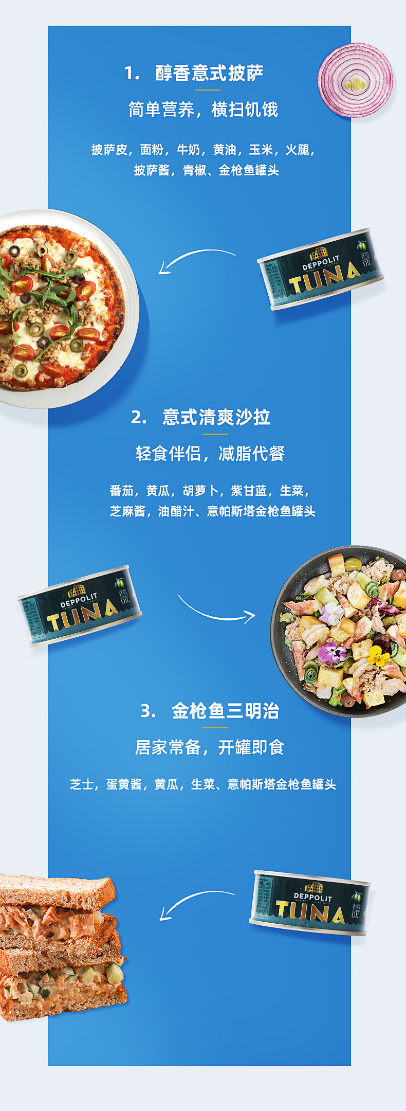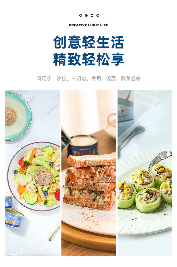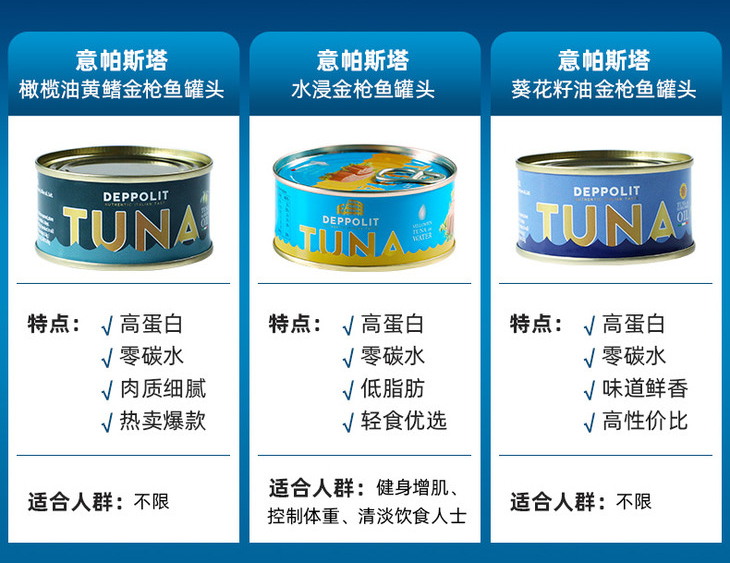意帕斯塔金枪鱼罐头有三种口味,橄榄油、葵花籽油和水浸款,其中橄榄油款是他们家的经典人气款,葵花籽油则更显鲜味,水浸款没有加油,是健身减脂和清淡饮食人群的轻食选择。