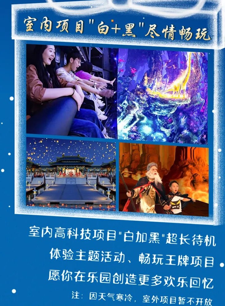高颜值NPC惊喜助阵,高颜值NPC降临乐园为大家送上暖心祝福更有超人气网红与你近距离互动快去四大主题区寻找你的crush。冰雪狂欢大巡游妙趣来,伴随着欢快美妙的音乐,精灵、雪人与熊出没家族萌趣登场定要伸出手与他们击掌互动呦。室内项目”白+黑"尽情畅玩,室内高科技项目"白加黑"超长待机体验主题活动、畅玩王牌项目愿你在乐园创造更多欢乐回忆。