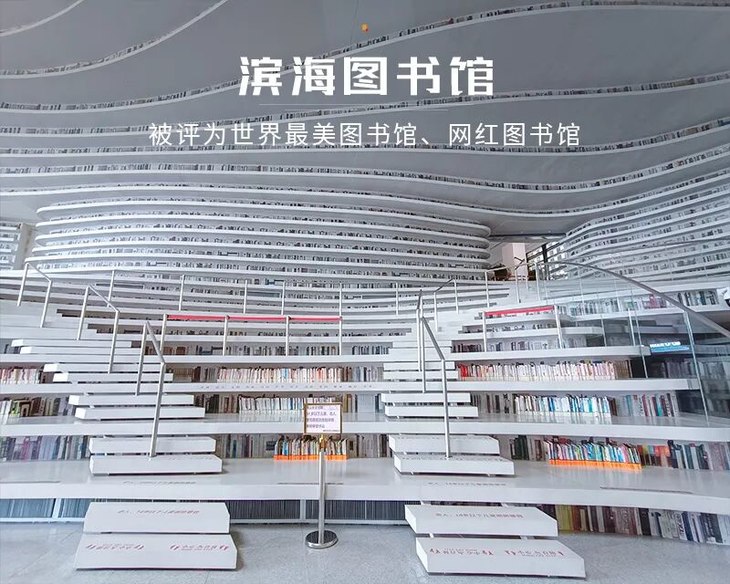 滨海图书馆被评为世界最美图书馆、网红图书馆。图书馆是由荷兰MVRDV建筑设计事务所与天津市城市规划设计研究院建筑分院合作设计,设计立意“滨海之眼”和“书山有路勤为径”,建筑面积33700平方米。