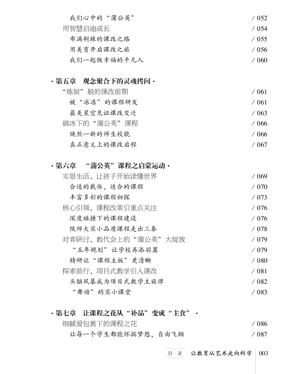 全书共分为 “上篇” “中篇” 及 “下篇” 三大部分。上篇重点阐述课程建设的阶段性理论成果,包含“蒲公英”课程体系建构、变革、发展等,主要呈现出当下最新的课程建设成果,进行全面而详细的展示。中篇重点讲述“蒲公英”课程相关理论诞生的过程以及经历的一次次变革。下篇讲述该课程体系建设下的具体实践,重点为成功的教育教学案例,从“德智体美劳”五育方面展示出“蒲公英”课程的可操作性等。