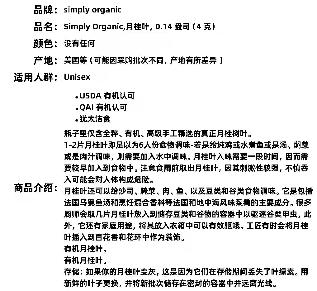 Simply Organic月桂叶4克膳食补充助于身体健康营养平衡