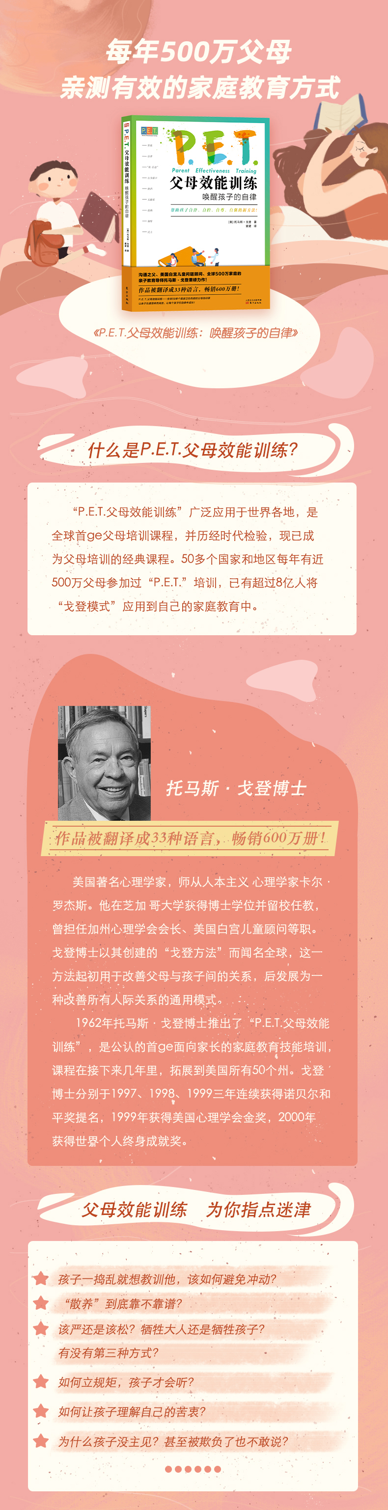 戈登博士在本书中分析了为什么传统的惩罚方法在家中和学校中无用的原因,以为如何应用合作的技巧使青少年们的行为更为有效。戈登博士发现了一个父母和老师都关注的问题——惩罚孩子。作为一个临床心理学家,他参考已发表的研究结果和他自己的经验,他反对惩罚孩子——以权力为依托的惩罚方式,这只能带来新的问题,比如叛逆和沮丧。他也给出了可行的替代方法。他揭穿了奖惩法的神话。一些人对他的方法有争议,但是因失败了的“大胆惩罚”和“严厉的爱”而泄气的父母和教师非常欢迎戈登的模式。 戈登抛弃了成年人要么会严厉地对待孩子,要么会溺爱孩子的观点,提供了第三种方法,既能解决成年人的需要,也能解决孩子的需要。在这种情况的影响下,孩子们学会了自律、负责任、合作和关心别人的重要技巧。孩子们也可以享受自尊——这对积极的心理健康和学校成绩是非常必要的。 这本书不仅仅是让父母和老师们得到一个会自律的孩子,还能改变父母和老师们整个的人际关系朝好的方向发展。