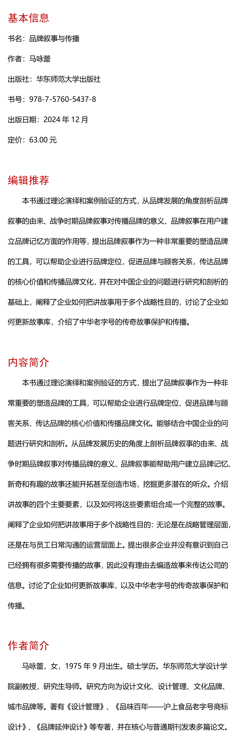 品牌叙事与传播 马咏蕾 理论演绎 案例论证 品牌发展