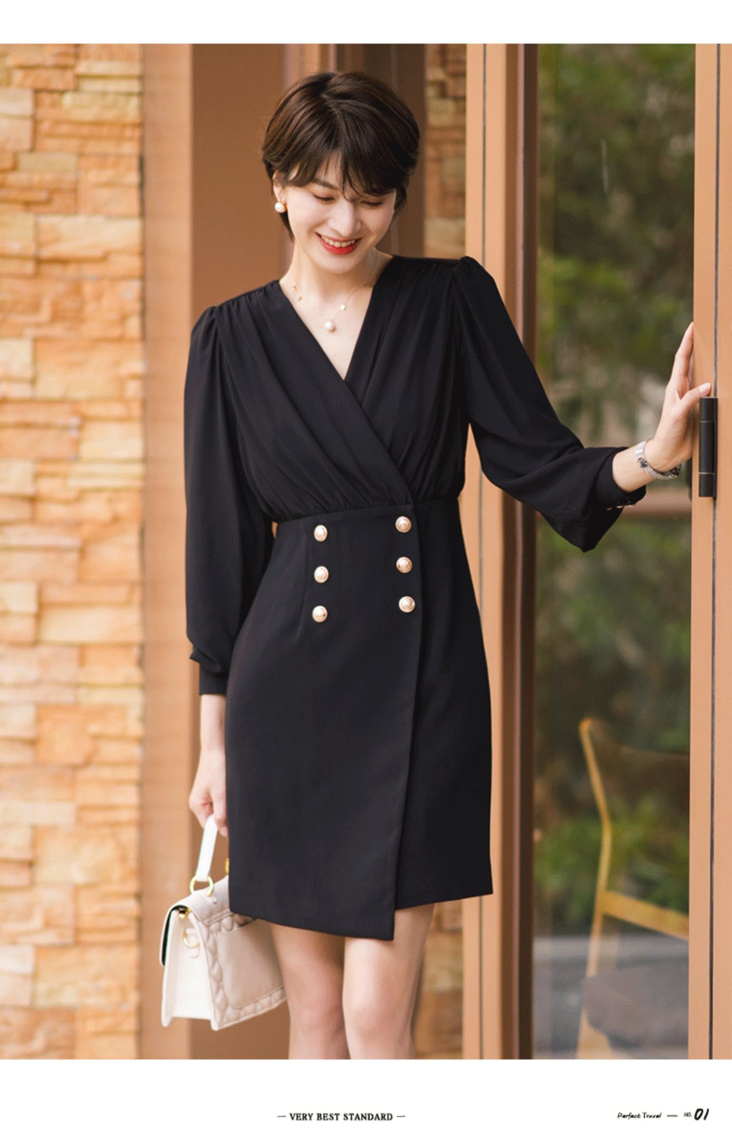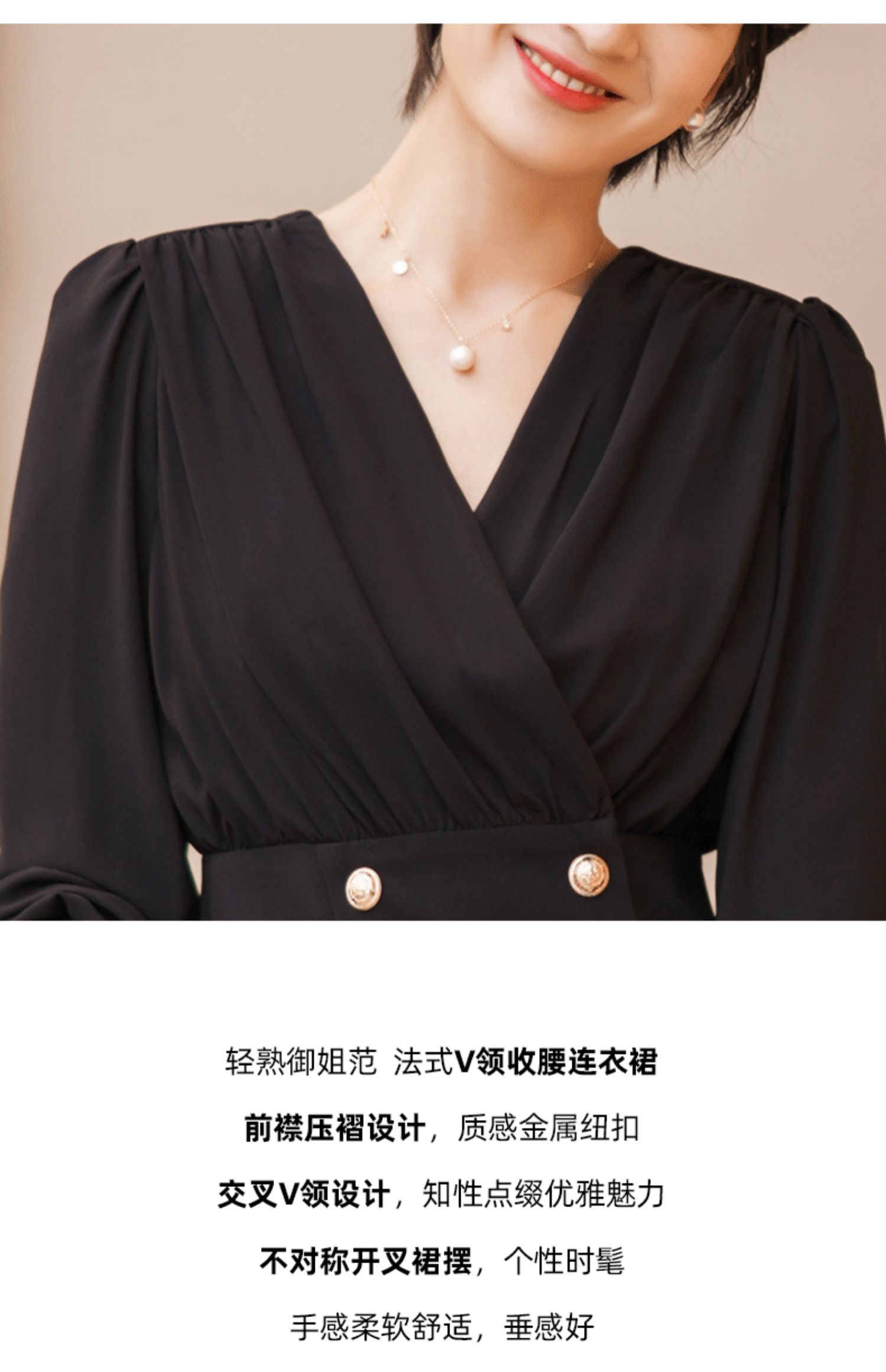 黑色连衣裙女春装新款高端气质轻熟风法式长袖收腰v领a字裙