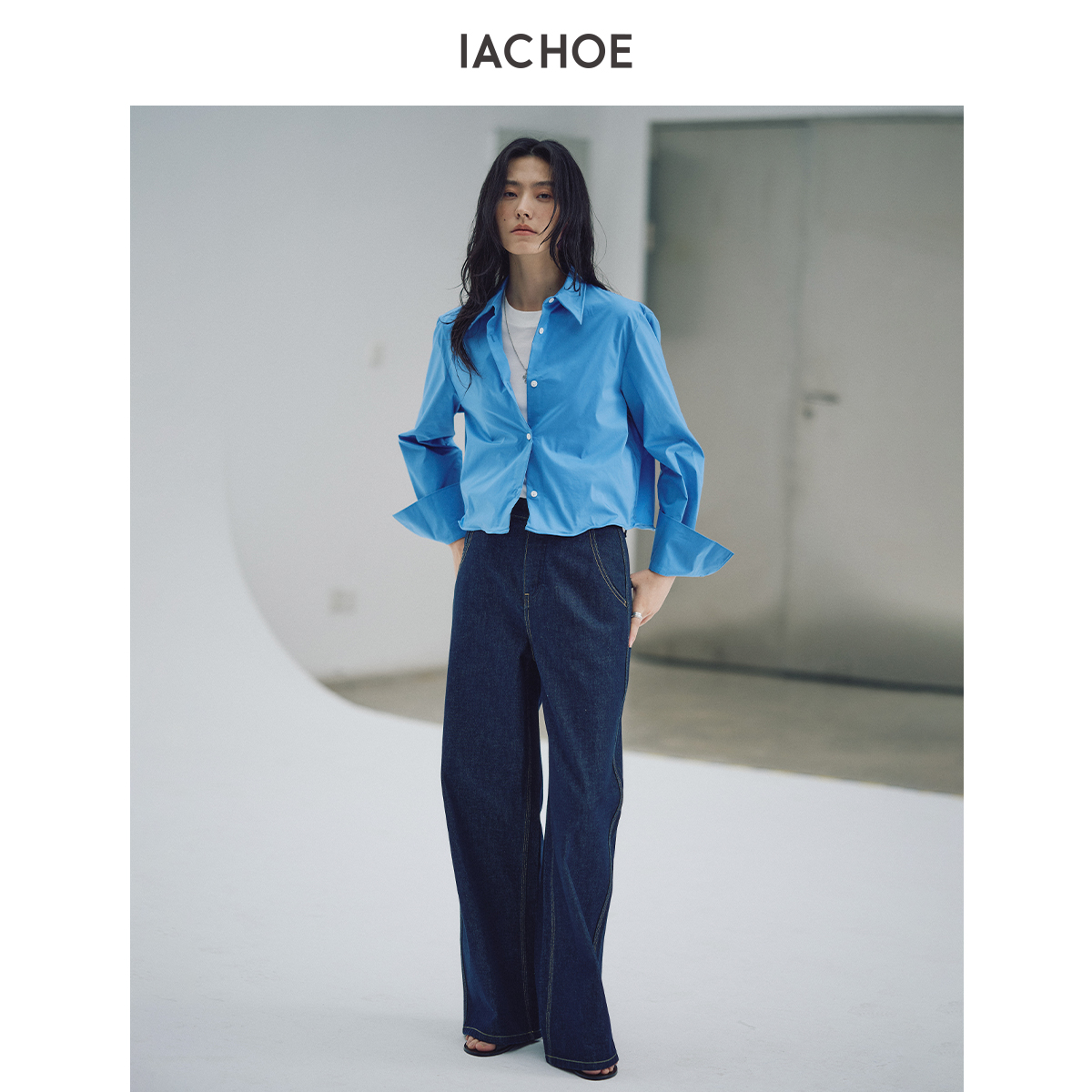 棉仓352619007-高腰阔腿全棉牛仔裤女立体褶裥剪裁 春秋复古单宁水洗拖地裤