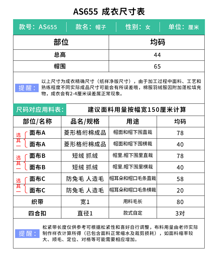 裁缝学苑AS655加绒加厚雷锋帽子纸样女装保暖防寒骑行包头帽样板