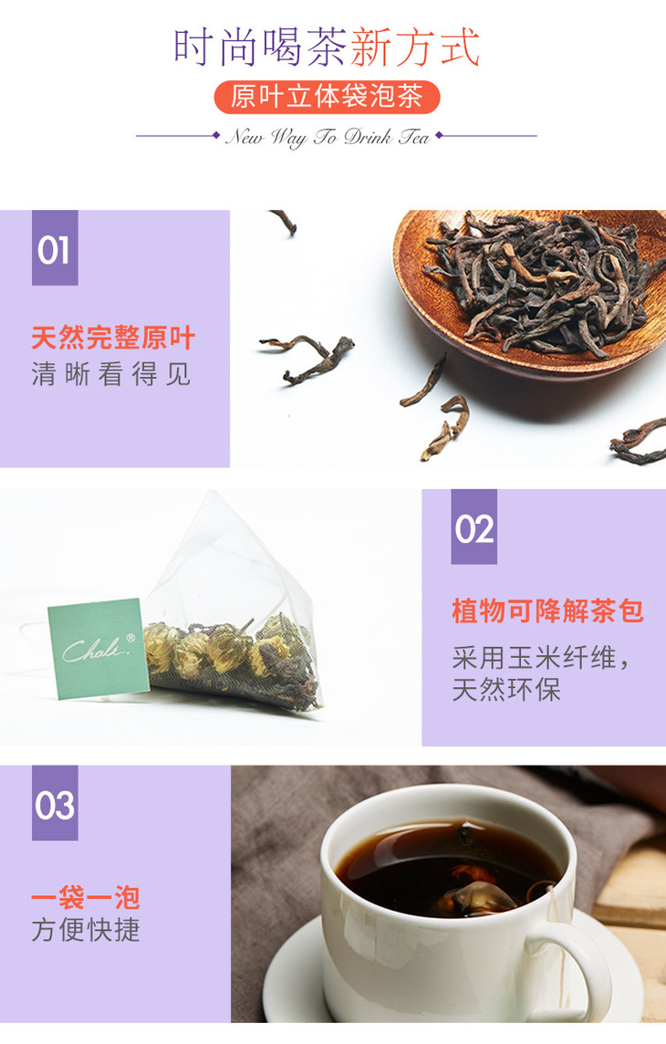 ChaLi茶里是中国袋泡茶第一品牌。坚持做本味中国茶。希望可以让客人在快节奏的生活中,撇除掉繁琐的茶道冲泡工序,用最简单方便的方式品尝到最传统的茶味。