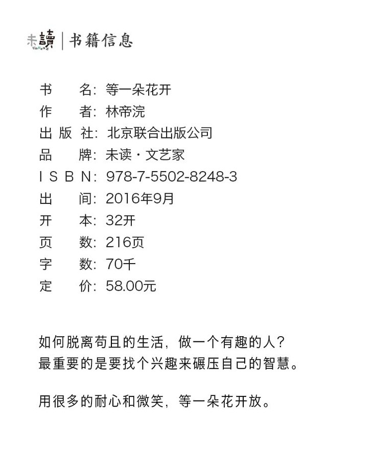 《中国诗词大会》舞台水墨绘制人、人文摄影师林帝浣(小林)书画散文随笔集,用很多的耐心和微笑,等一朵花开放。中央电视台拍摄的同名纪录片同步播出。