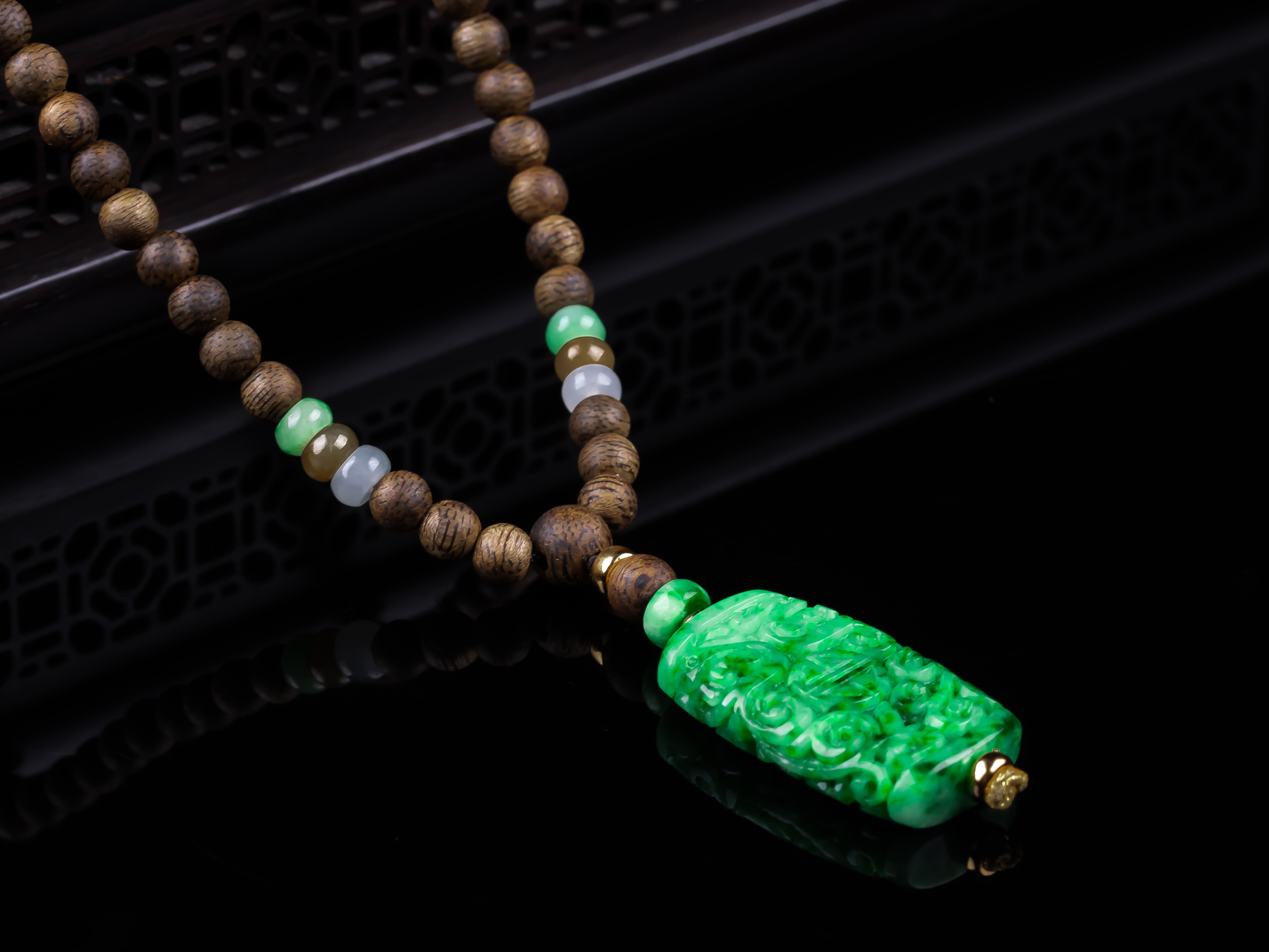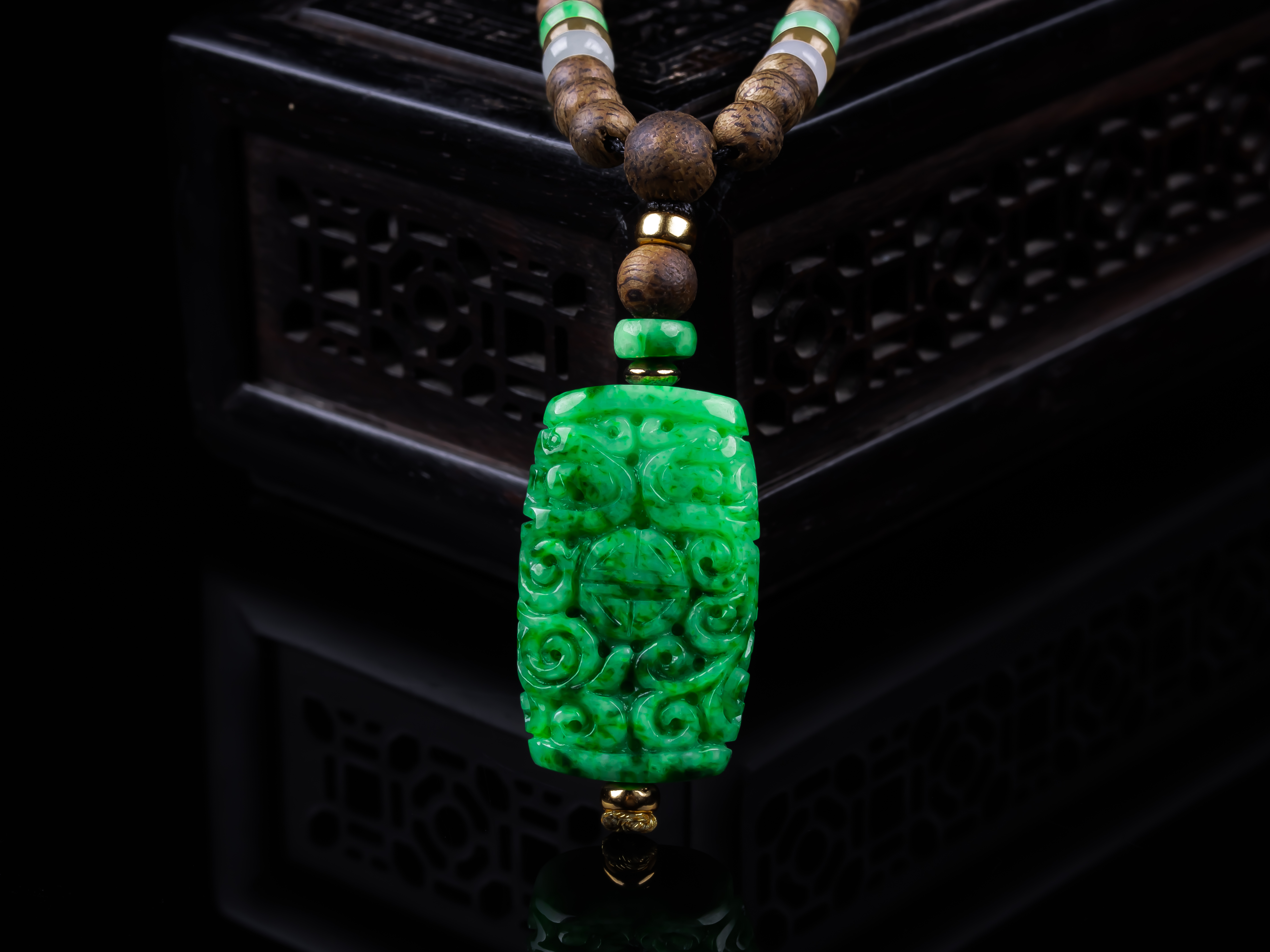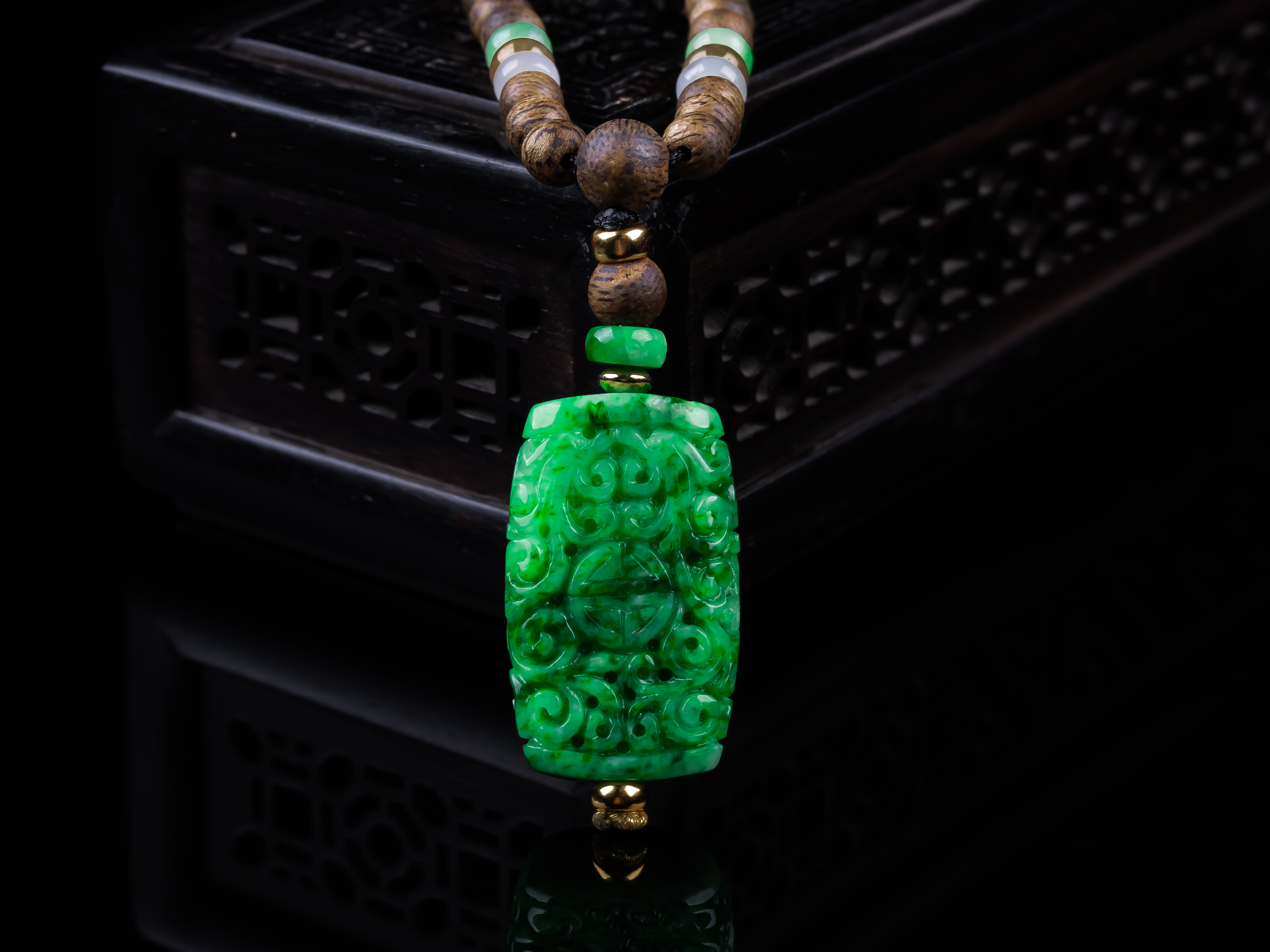 XY0293沉香+满色翡翠复古祥纹挂件,天然沉香约5mm,原色原味,香味自然清甜,配珠:925银、南红、翡翠。一颗满色的复古祥纹坠子,古色古香的韵味,款式设计雅典大方,带着中国经典的美感。