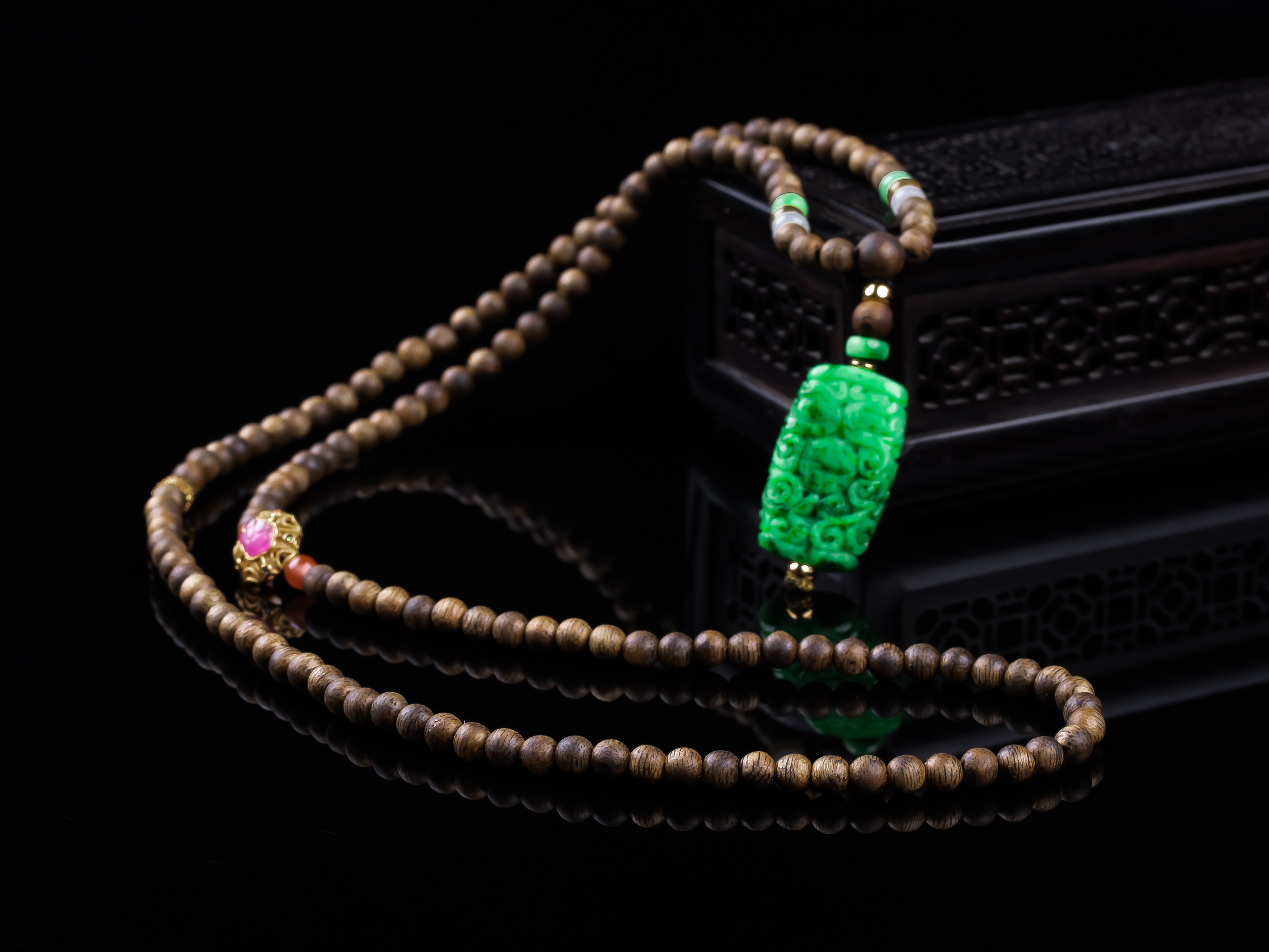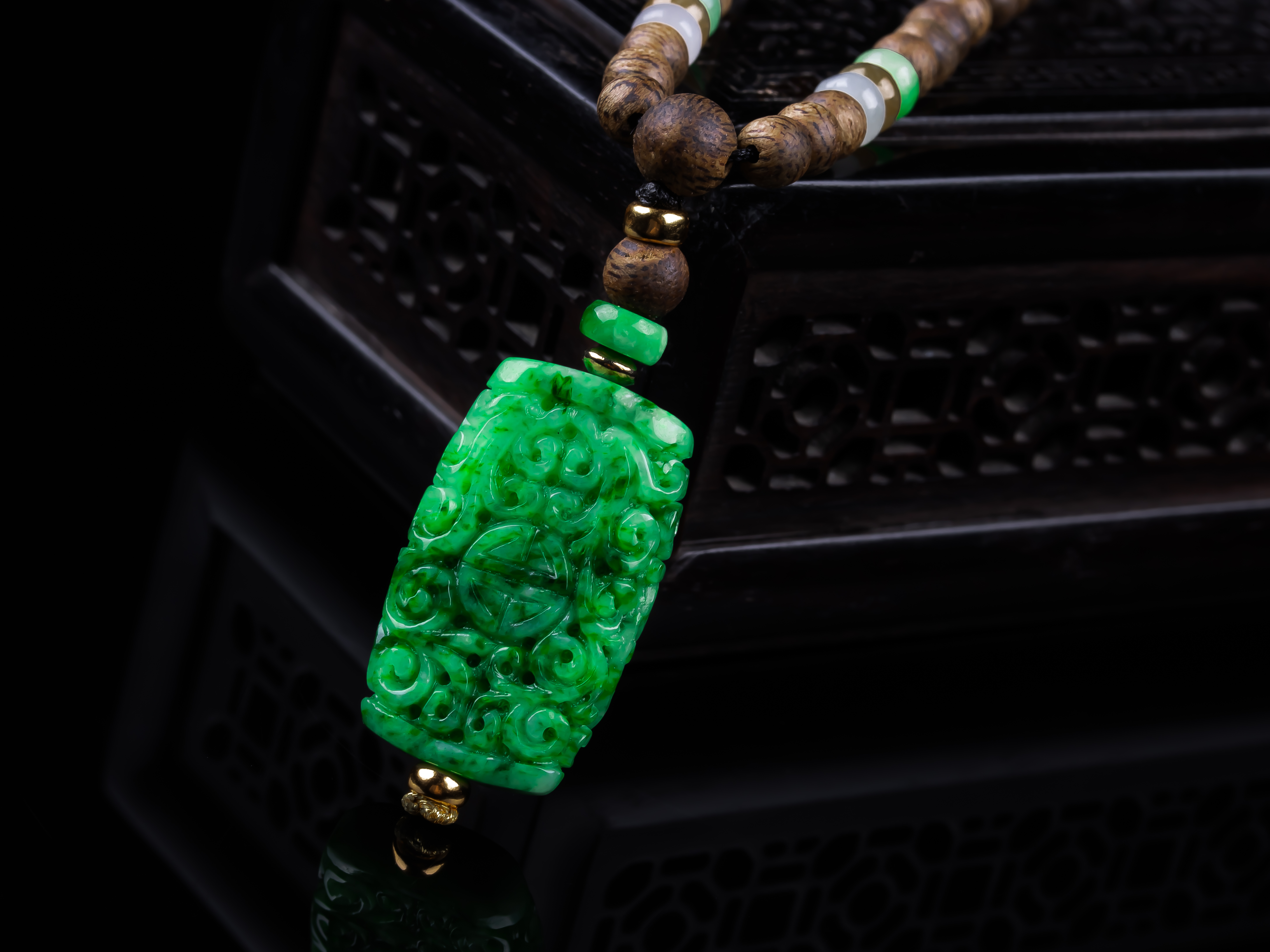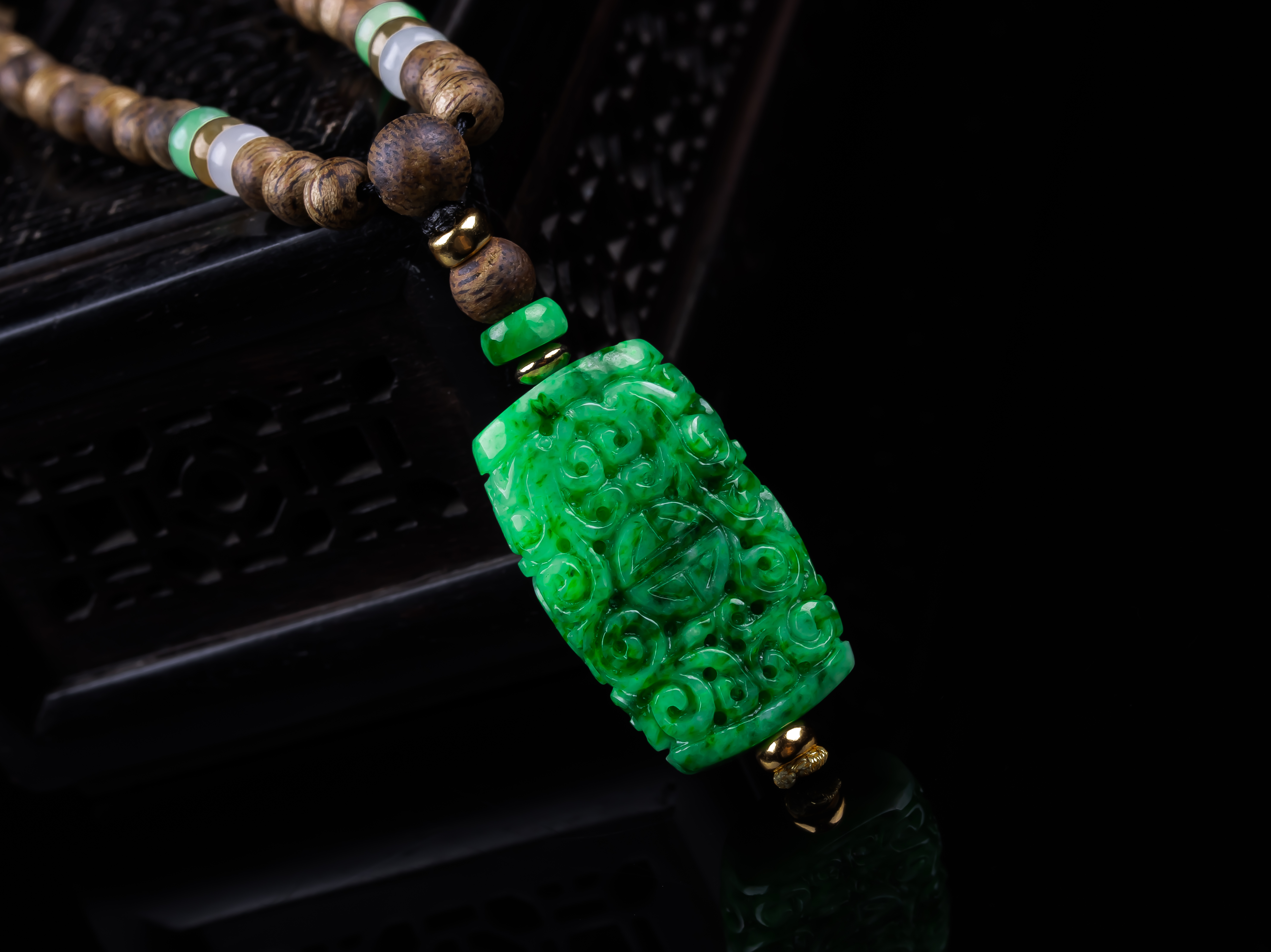 XY0293沉香+满色翡翠复古祥纹挂件,天然沉香约5mm,原色原味,香味自然清甜,配珠:925银、南红、翡翠。一颗满色的复古祥纹坠子,古色古香的韵味,款式设计雅典大方,带着中国经典的美感。