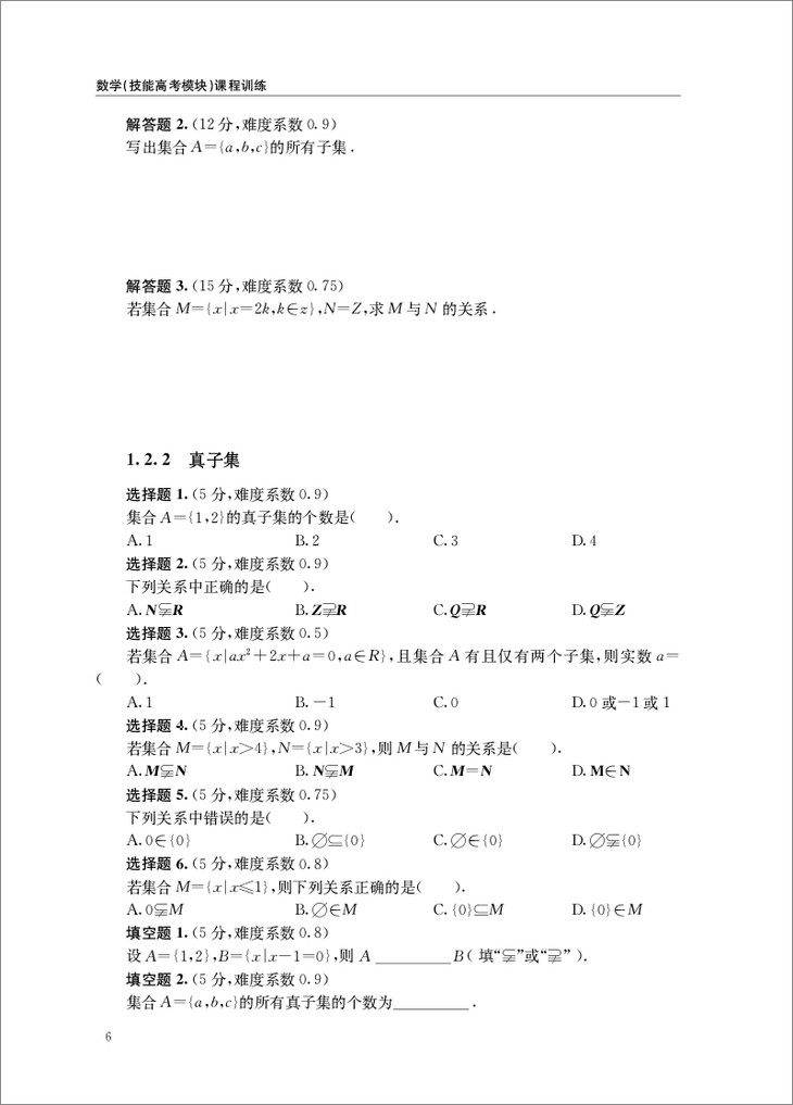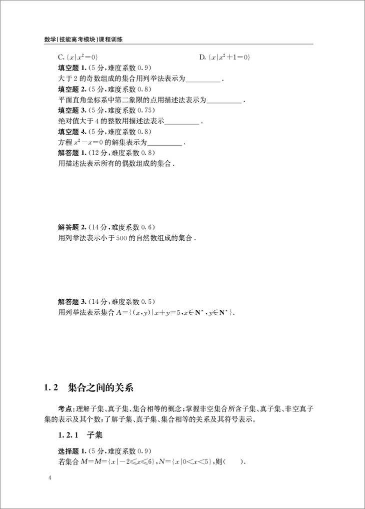 本丛书按章节顺序编写,与高等教育出版社出版的中等职业教育课程改革国家规划 新教材 《数学 (基础模块)》(上、下册)同步,每节以知识点为单位编写,每个知识点 对应一个训练,训练习题部分针对每一个知识点选取了适量习题,还标明了难度系数, 以适应不同层次水平的学生练习。每章前面都配有知识结构框图,帮助学生建立整个知 识结构体系,在知识结构框图后面还标明了每个知识点的学习要求;每章后面配有一套 章节测试题。此外,本丛书对预备知识部分编写了相关的配套练习,为学习新知识奠定 基础。