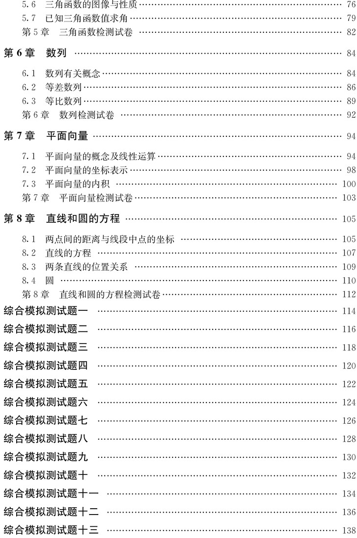 本丛书按章节顺序编写,与高等教育出版社出版的中等职业教育课程改革国家规划 新教材 《数学 (基础模块)》(上、下册)同步,每节以知识点为单位编写,每个知识点 对应一个训练,训练习题部分针对每一个知识点选取了适量习题,还标明了难度系数,以适应不同层次水平的学生练习。每章前面都配有知识结构框图,帮助学生建立整个知识结构体系,在知识结构框图后面还标明了每个知识点的学习要求;每章后面配有一套 章节测试题。此外,本丛书对预备知识部分编写了相关的配套练习,为学习新知识奠定 基础。