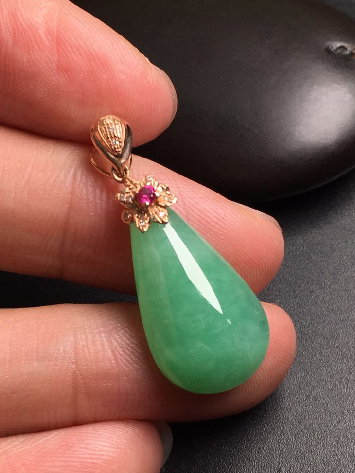 【D13215】翡翠18K镶嵌苹果绿水滴吊坠,水润光泽,饱满细腻,色泽亮丽,完美无裂,佩戴美观大气!裸石尺寸:23.6*12.5*6.3mm,特价1550