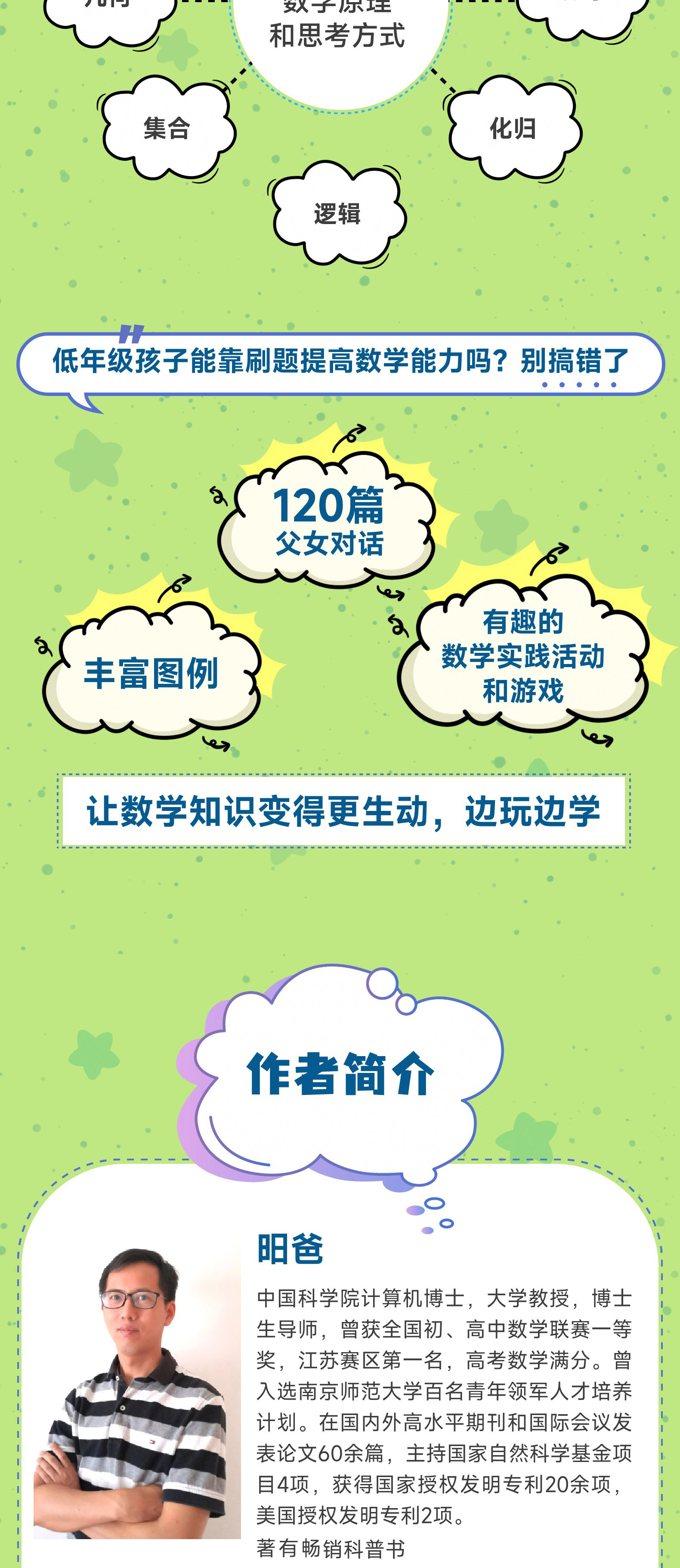 昍爸(本名张国强),中国科学院计算机博士,大学教授,博士生导师,曾入选南京师范大学百人计划、江苏省333高层次人才培养工程,美国加州大学访问学者。在国内外高水平期刊和国际会议发表论文60余篇,主持国家自然科学基金项目4项,获得国家授权发明专利20余项,美国授权发明专利2项。 他将自己的科研方向与数学教育实践结合在一起,做了积极探索,形成别具一格的少儿数学思维和计算思维的科学训练体系,并开设了广受欢迎的“昍爸说数学与计算思维”(xuanbamath)。著有《写给孩子的数学之美》,该书入选中国计算机学会第四期“CCF科普阅读推荐图书”,2023百道好书榜年榜少儿类*00榜单,广受读者好评。 昍妈(本名范艳),杂志编辑,十余年来一直在教育教学一线,关注当前国内外教育理论发展,对基础教育阶段的课堂教学有深入的了解。