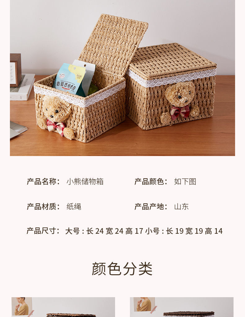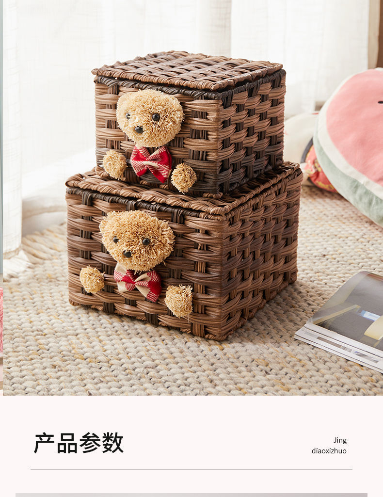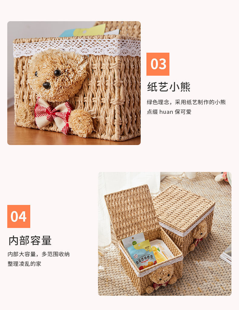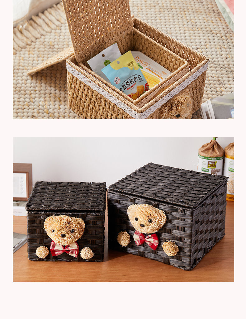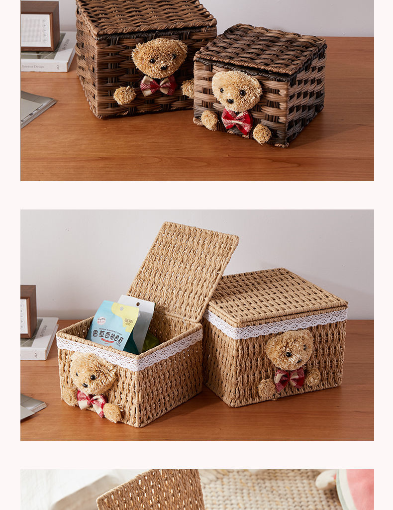 家用手工编织收纳筐零食化妆品带盖卡通小熊收纳篮田园可爱储物箱