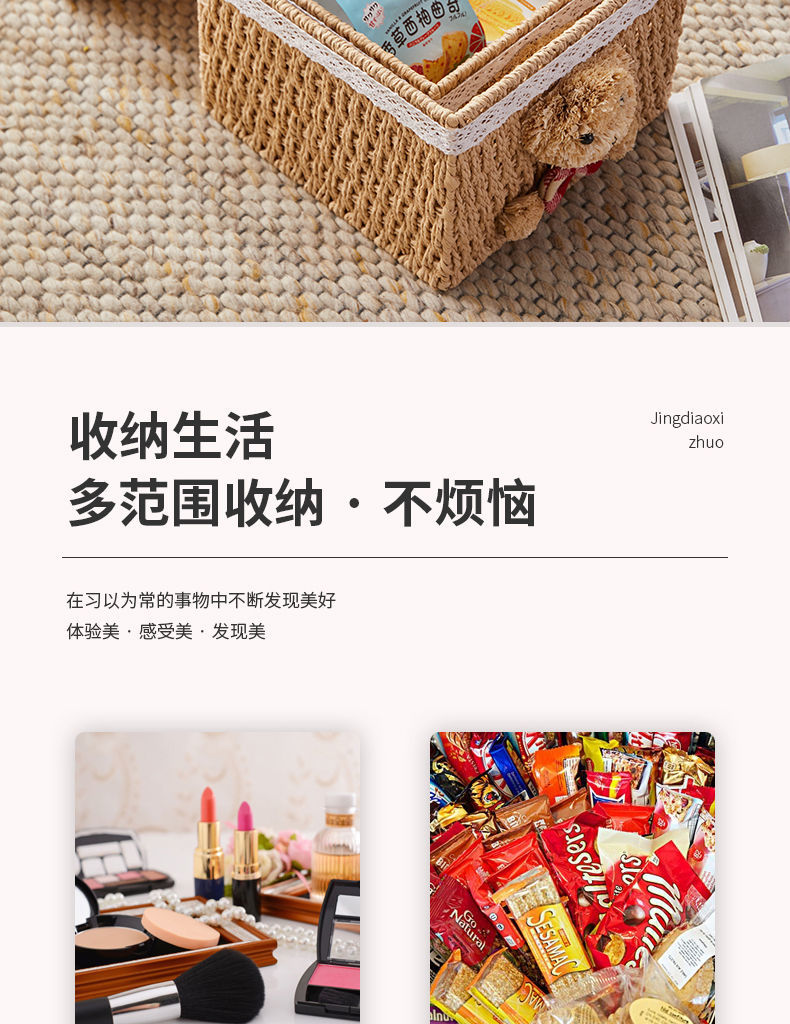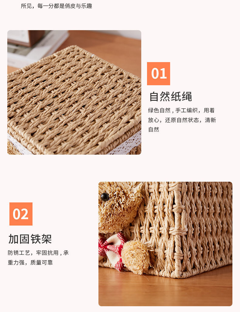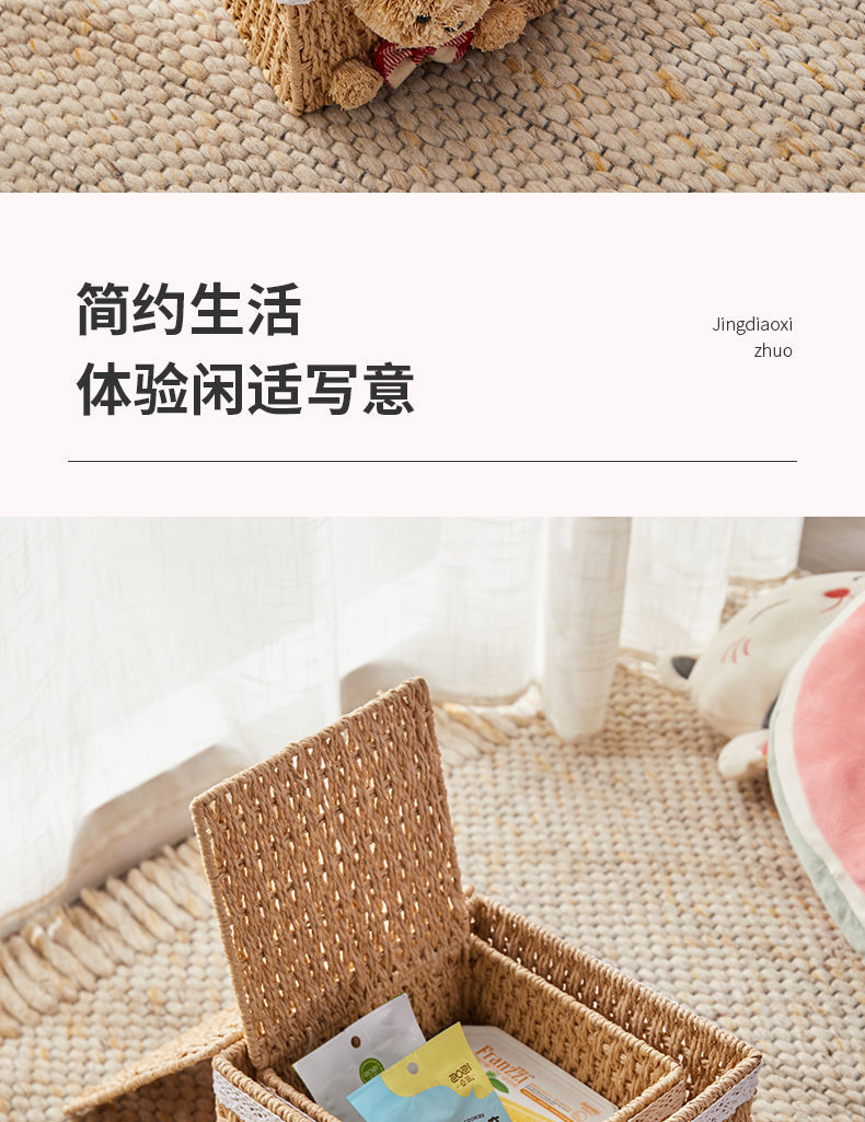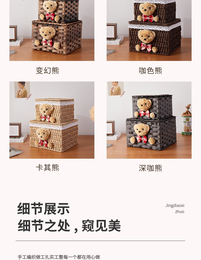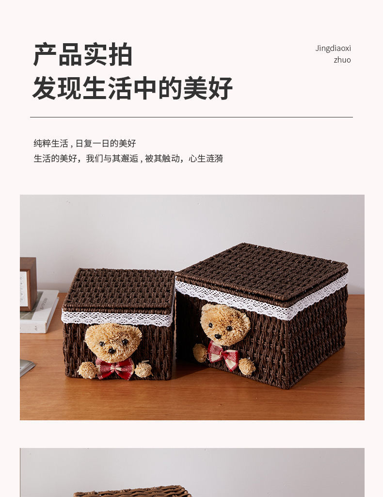 家用手工编织收纳筐零食化妆品带盖卡通小熊收纳篮田园可爱储物箱