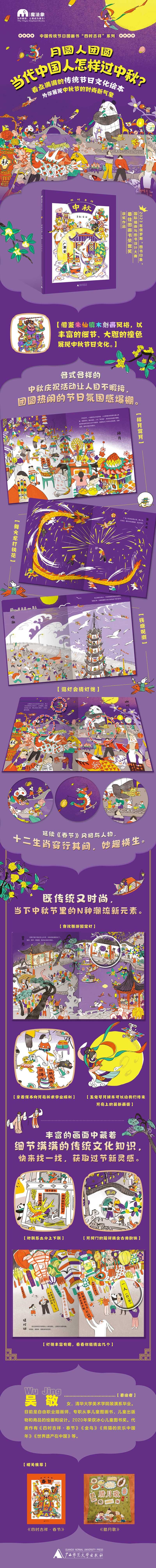 《四时吉祥中秋》是;四时吉祥系列图画书的第二册。当代中国人怎么庆祝传统中秋?本书展示了中秋前后的传统习俗和场景,十二生肖在故事中集结,陪伴中国家庭的大人和小孩做月饼、赏月、猜灯谜、舞火龙一起团团圆圆过中秋。故事既保留了传统习俗,又呈现出当代中国的新气息,以丰富生动的细节展现古老又时尚的中国,用传统年画的色彩描绘出中国人的幽默、创造力和童趣,展现了中国人特有的;海上生明月,天涯共此时的精神追求与阖家团聚、欢度中秋的热闹与温馨。