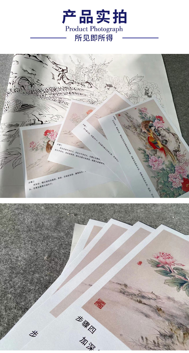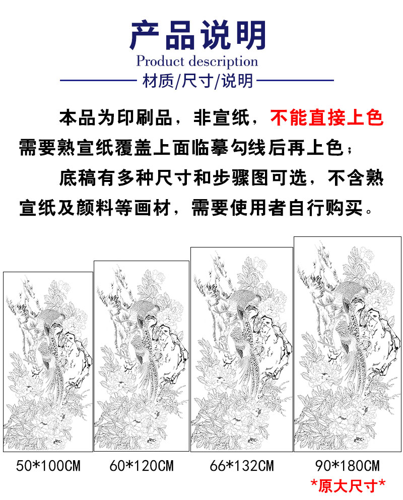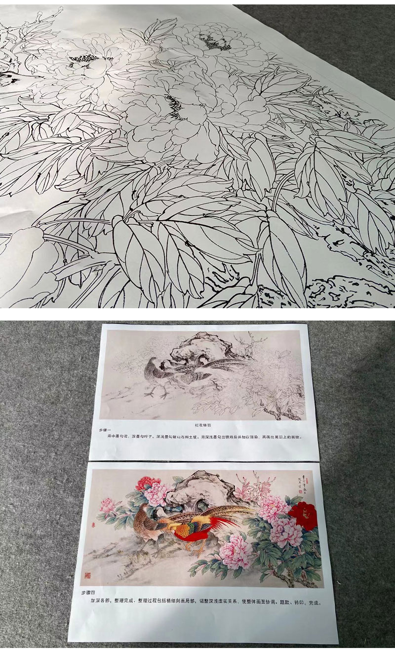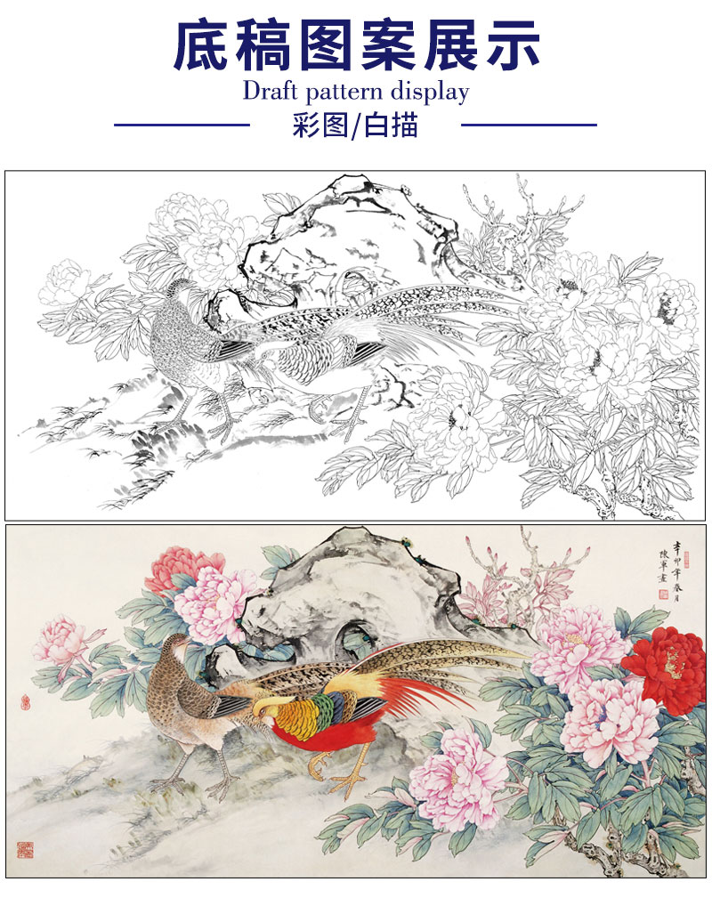 【有步骤】陈军四尺横幅工笔画白描底稿《红花锦羽》锦鸡牡丹初学者临摹花鸟线稿CJ22