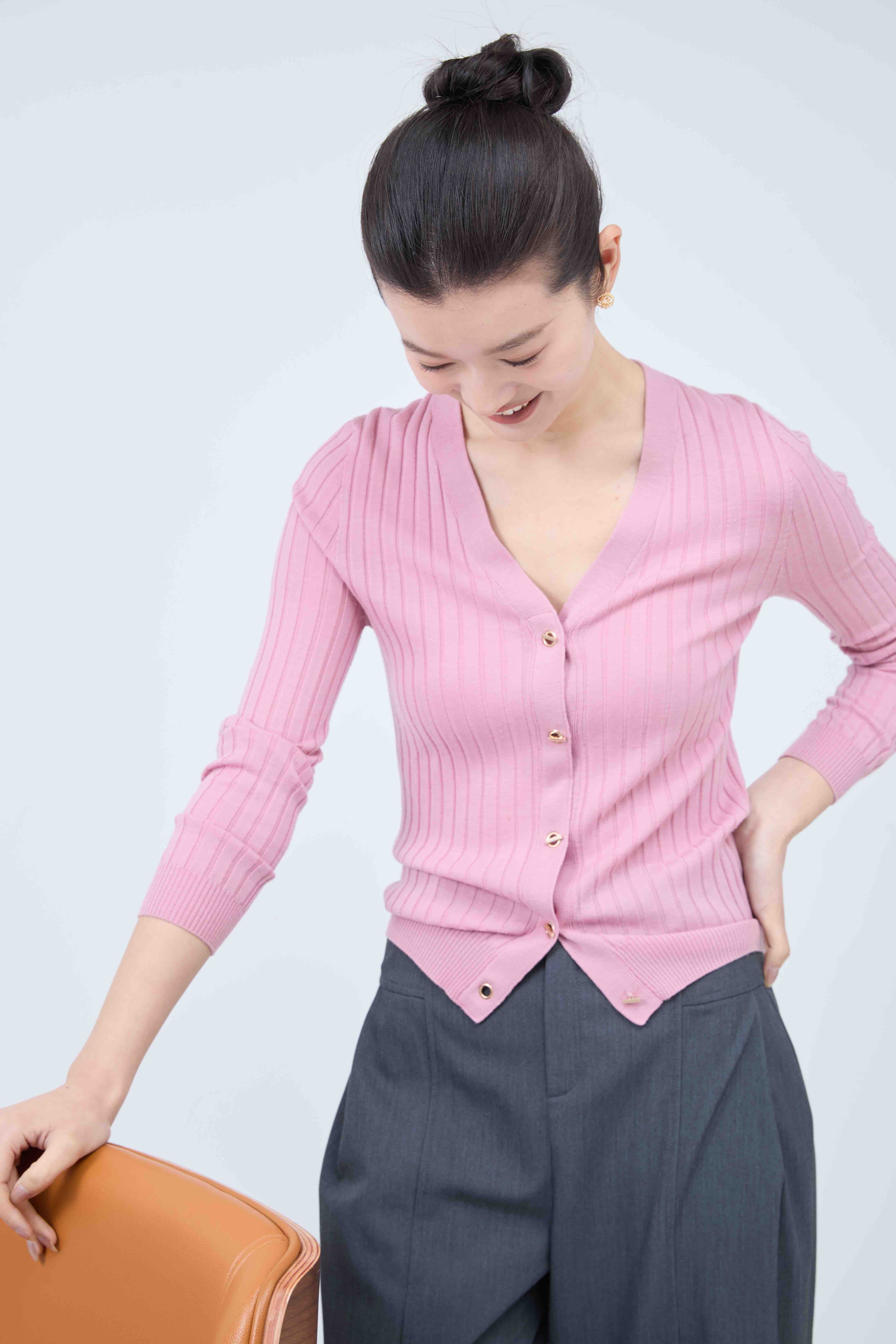 气眼扣v领新增了春夏的樱花粉