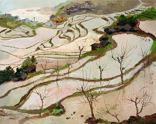 胸中已伏龙蛇,但绘画还须从色调开始,先铺色。铺满了油彩的画面难于用色彩勾勒,我多半是用大笔扁侧着将色切入画面,如一经涂抹,翻动了底色,则将无法收拾或者索性扬弃水光天色之色彩变化,既避免了油色之滞凝,更着力于发挥线之盘旋与疏密,当又可创造另一番境界与腔调,这便是我经常将油画水田移植进水墨的初衷。