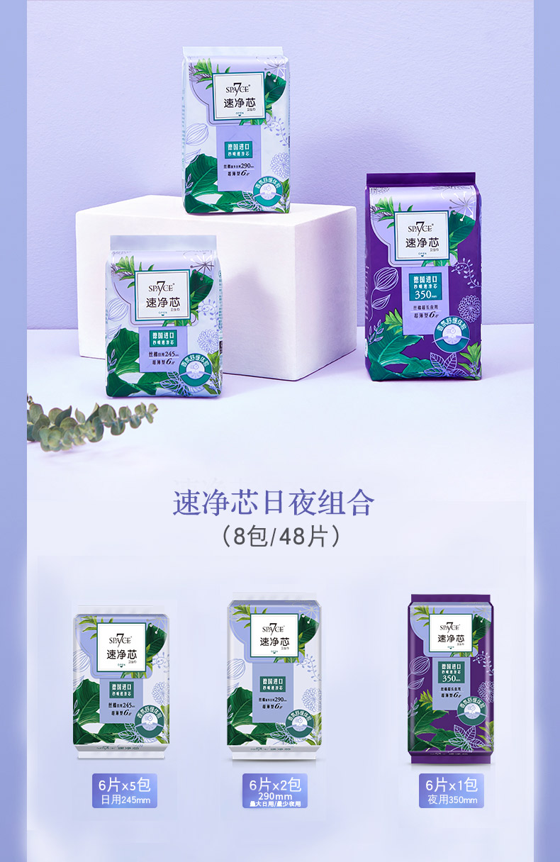 七度空间 速净芯日用夜用卫生巾套装8包48片(245mm*30片+290mm*12片+350mm*6片)