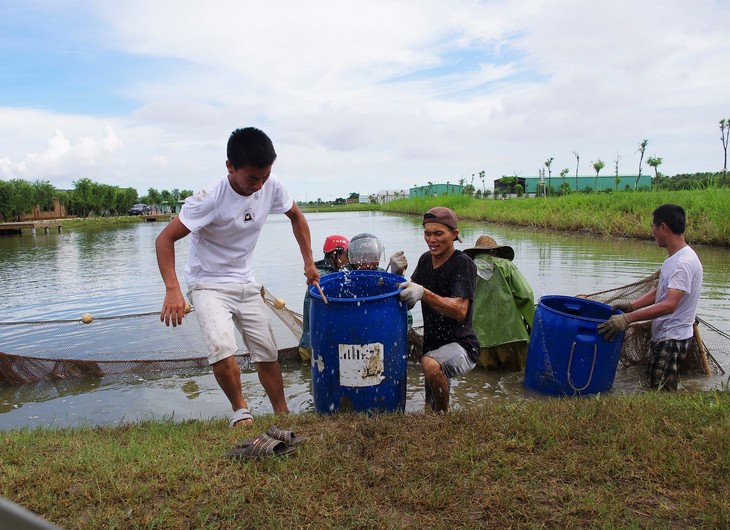 人工拉网捕捞,每一次拉网都需要两位师傅在水下操作,鱼塘两边又各两名壮士协助拉网。拉完网后挑选出达到配送标准的鱼,重量不达标的再回到鱼塘继续喂养。鱼塘右边浓密粗壮的绿色植物即是专门用来喂鱼的象草,既能稳固堤岸,又能提供高蛋白高消化的优质营养。