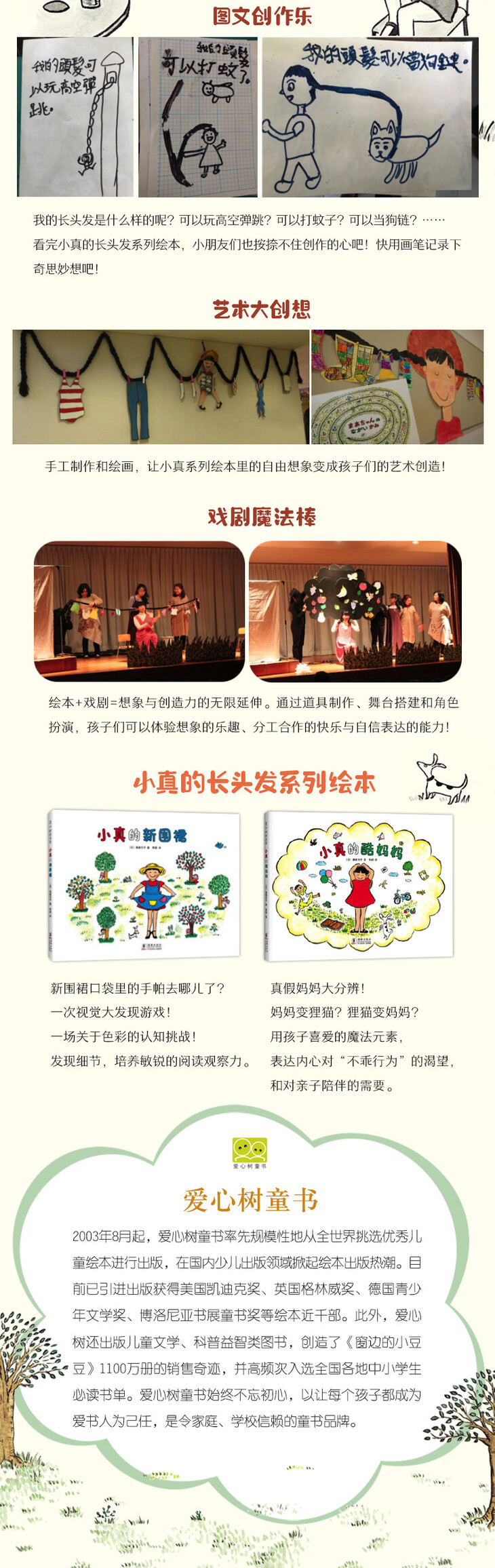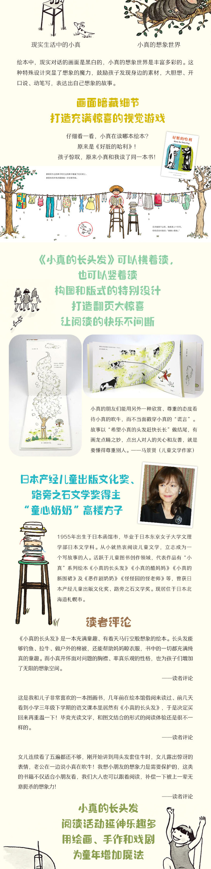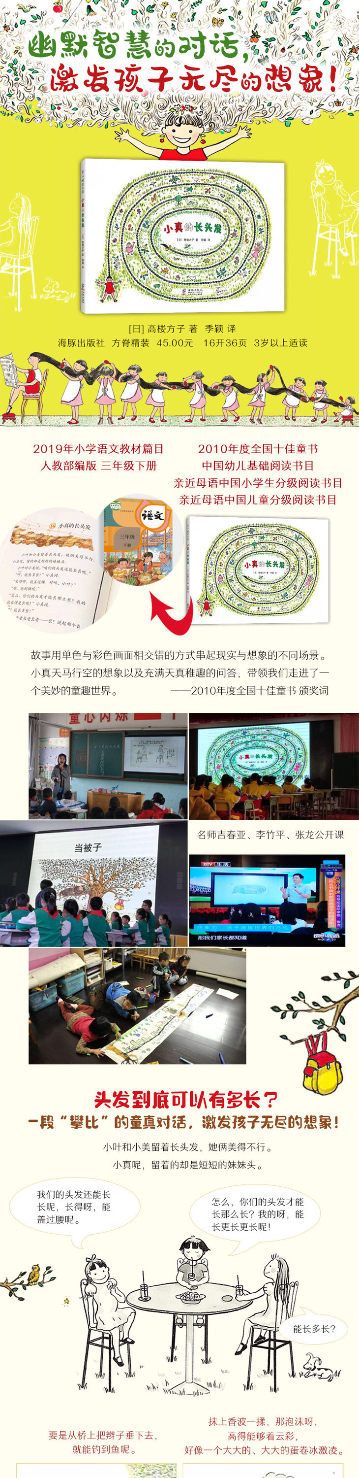 这是我和儿子最喜欢的一本图画书,前几天看到小学三年级的语文课本里居然有《小真的长头发》,于是买回来再重温一下!毕竟光读文字,和图文结合的形式的阅读体验还是很不一样的。