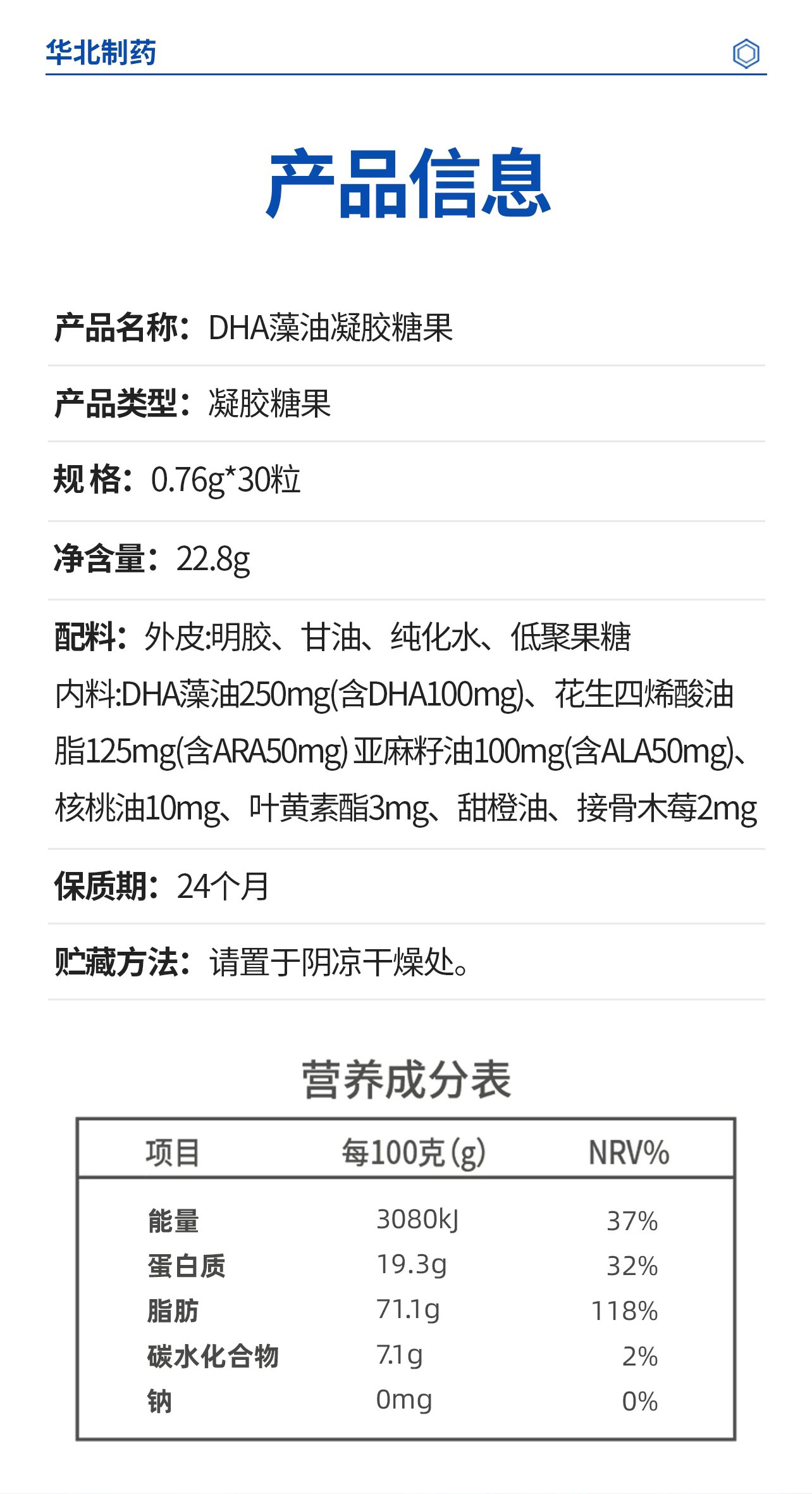 华北制药DHA藻油凝胶糖果 每粒含DHA100mg 易食用 妈妈放心选择