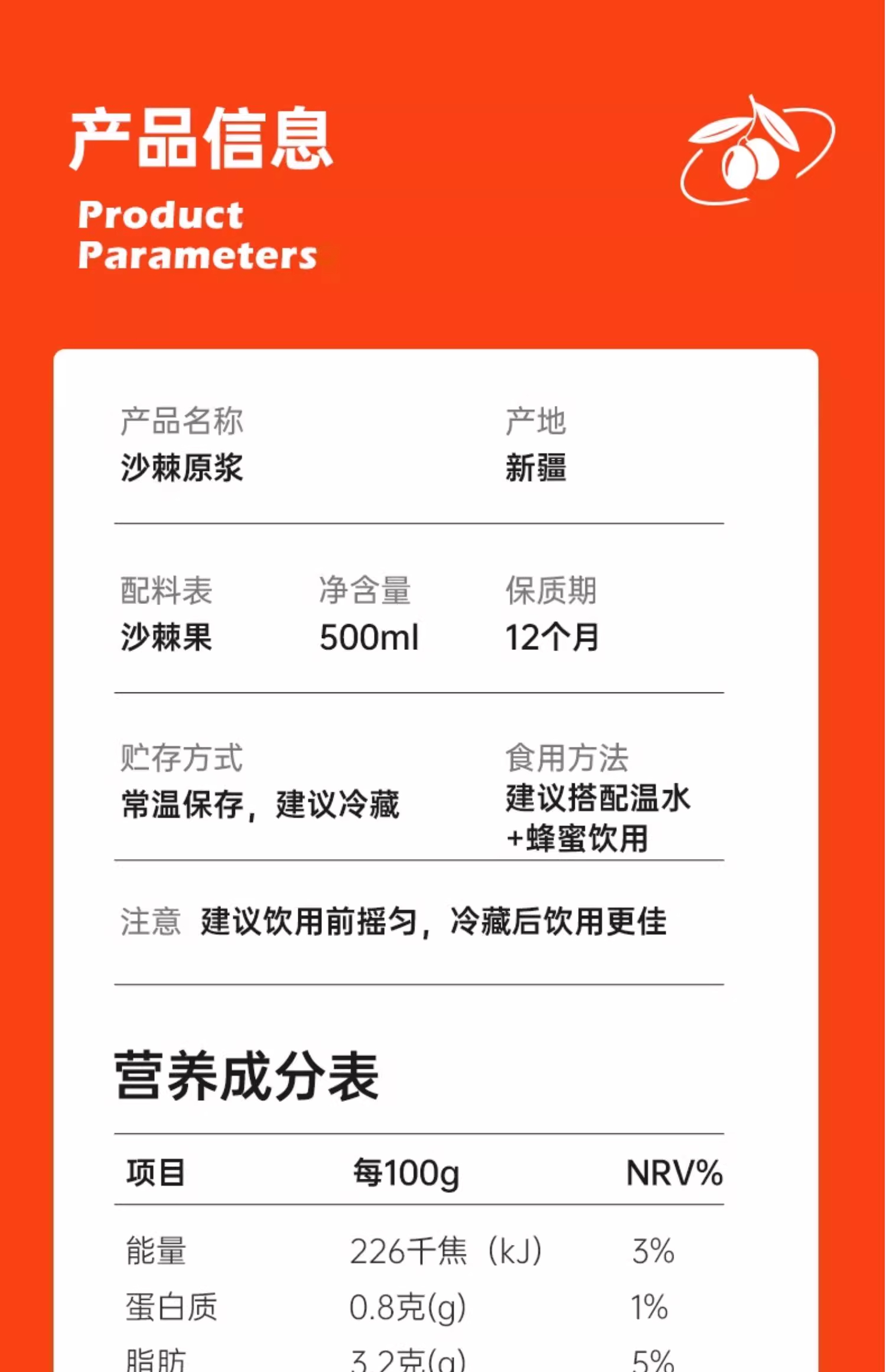 玛依莎·大果沙棘原浆 500ml*4 酸甜醇厚 助力每日活力