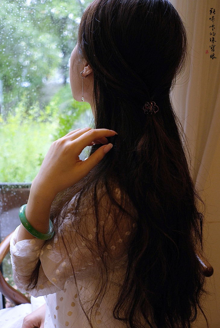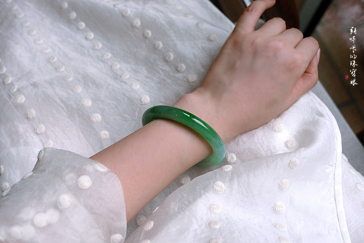 这是我个人收藏了一段时间的绿镯,每次戴出去,都被同行们以及翠友们称赞。最近设计作品进度有些跟不上上新需求,故只好把私藏的好镯也拿出来贡献了。为什么这么喜欢这一只,也是因为它讨巧,辣绿的飘色使得镯子的观感好似上百万级别的效果。同料子出的飘色若少一点就一下子显得不那么高贵。而若真要色更满的,几百上千万也正常。美就美在,绿色飘的数量和位置刚刚好,正是映绿了大半条镯。虽然细看略有杂点,但瑕不掩瑜。也因此,后来几乎没有遇见相似的却有很好性价比的绿镯,有道是,可遇不可求。随缘来去,得之且珍惜。