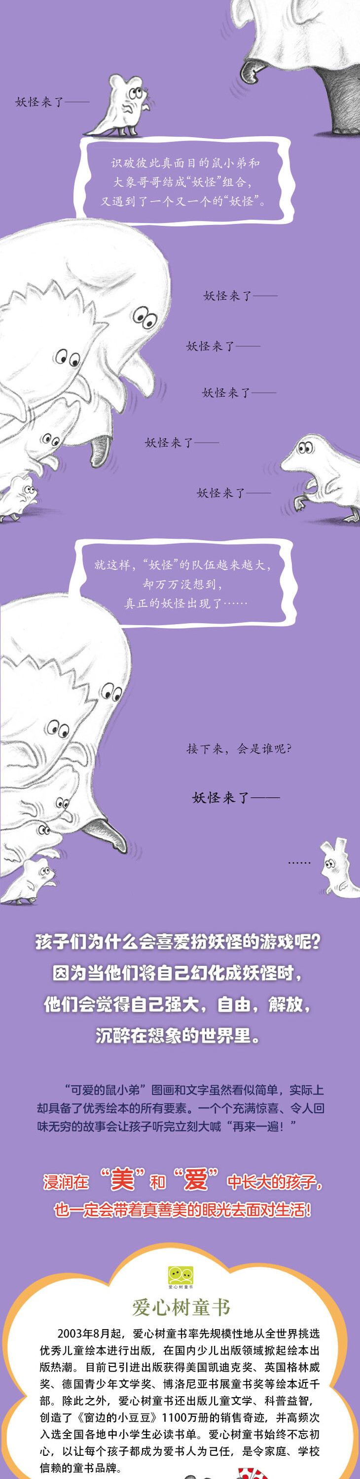 “妖怪来了——”披着被单,扮成妖怪的鼠小弟把鼠小妹吓跑了,决定继续吓唬其他朋友,却遇到了同样扮成妖怪的大象哥哥。识破彼此真面目的鼠小弟和大象哥哥结成“妖怪”组合,又遇到了一个又一个的“妖怪”。就这样,“妖怪”的队伍越来越大,却万万没想到,真正的妖怪出现了……