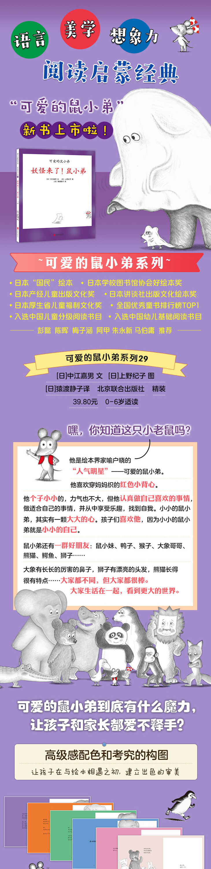 “可爱的鼠小弟”系列是日本绘本作者中江嘉男和上野纪子合著的不朽经典,自1974年诞生以来,斩获日本各大童书奖项——日本学校图书馆协会好绘本奖、日本产经儿童出版文化奖、日本讲谈社出版文化绘本奖、日本厚生省儿童福利文化奖,堪称日本“国民绘本”。
