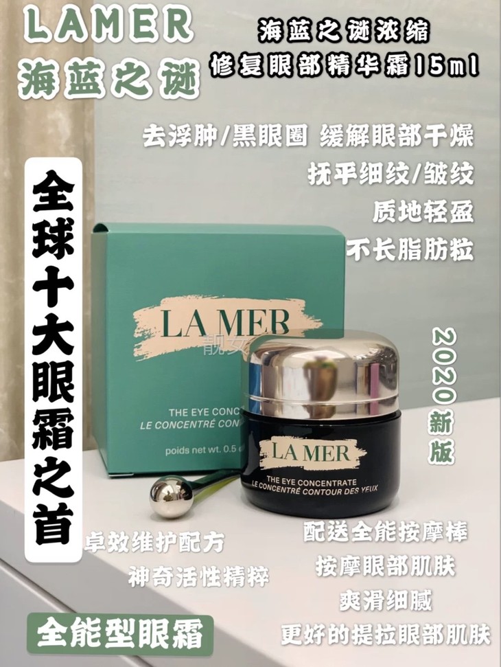 LA MER浓缩密集修护眼霜15ml#新款👍这款眼霜功效非常全面,一大堆眼部问题👀,又想偷懒一次解决的,就选这款浓缩修复眼霜🌟。对眼部细纹、黑眼圈暗沉、浮肿、松弛问题都有改善✔。质地很清爽,保证了所有肌肤都可以安心使用👯,丝毫不用担心长脂肪粒哦~包装内附有专用的眼部按摩银棒🤩,搭配使用轻压眼部血管,促进微细循环♻,消除眼部倦怠,帮助眼周代谢废物排出,所以对于消除眼部浮肿、黑眼圈效果很好!使用前放冰箱里冰3-5分钟🌀,效果更佳哦
