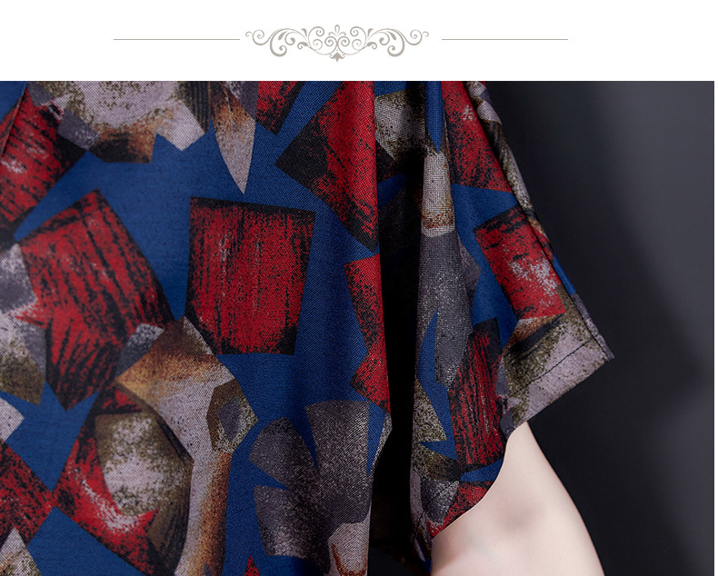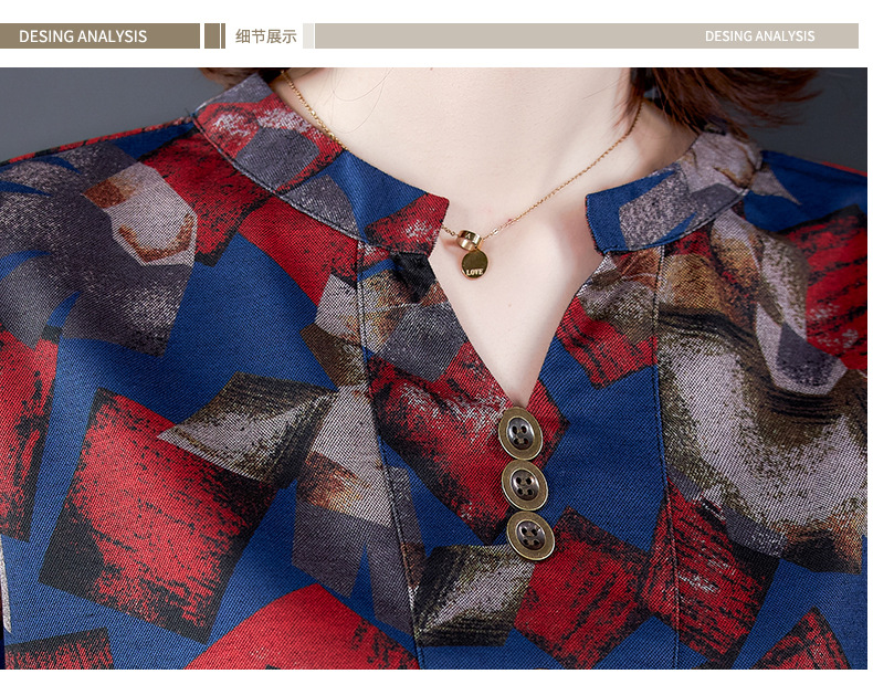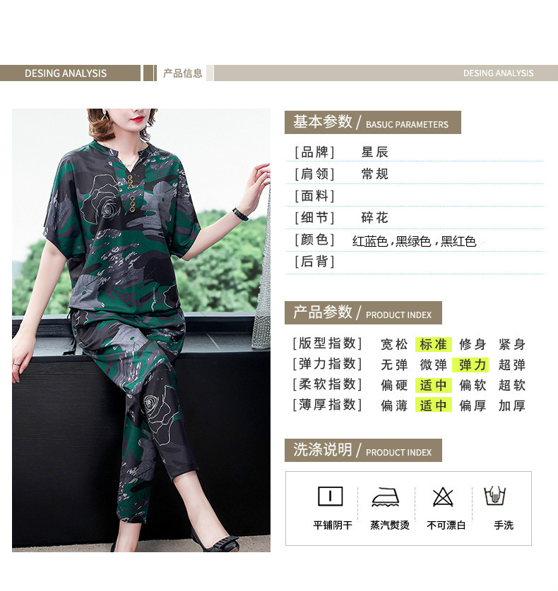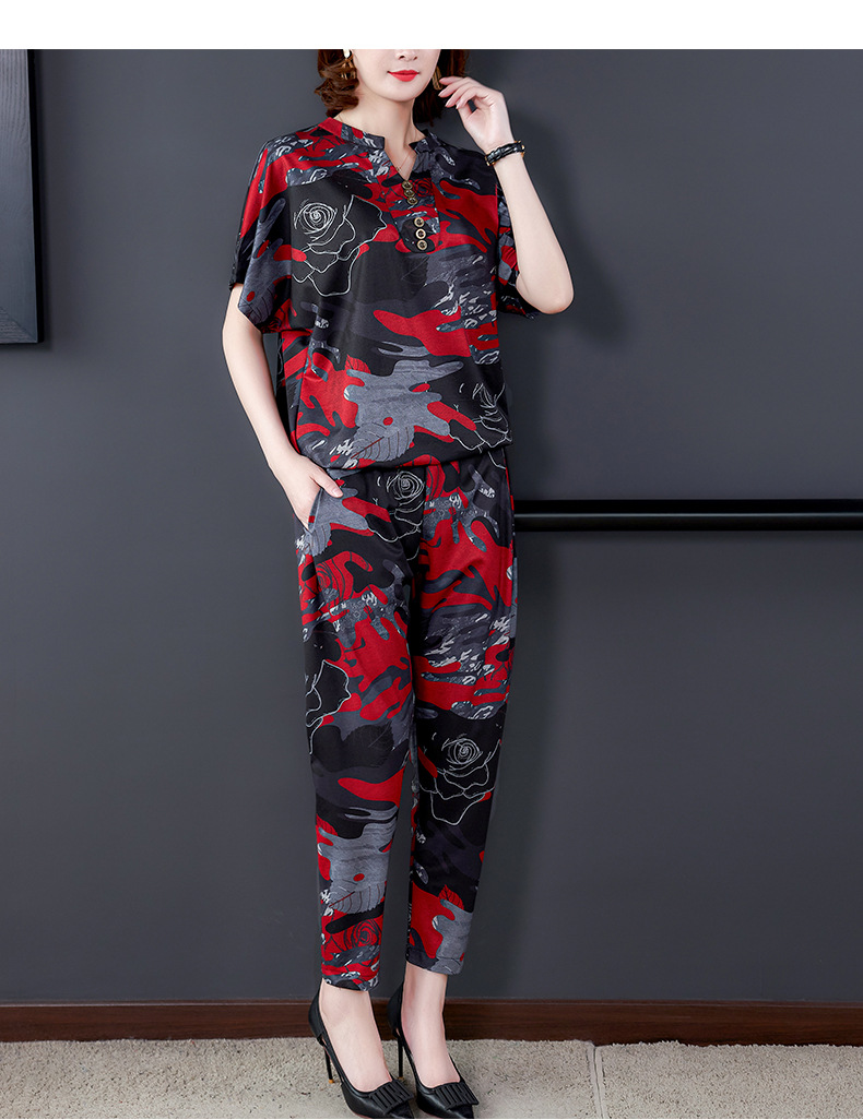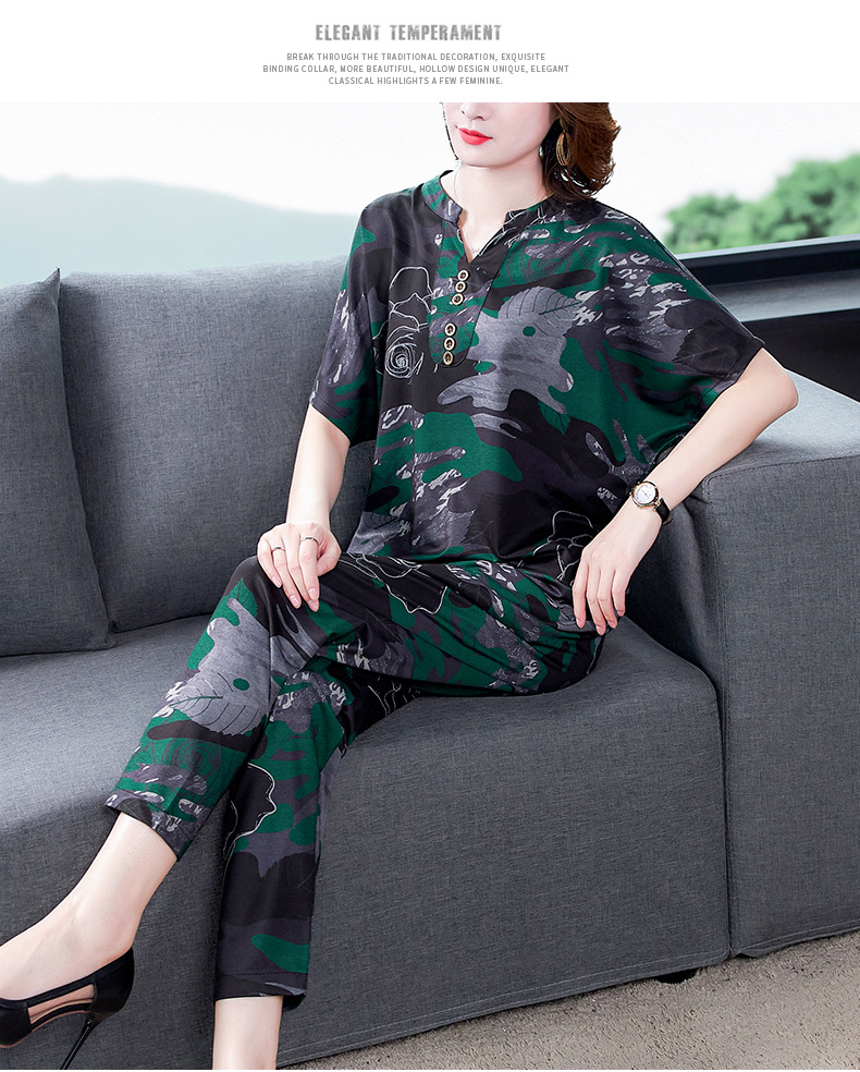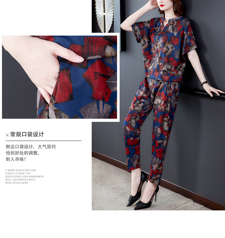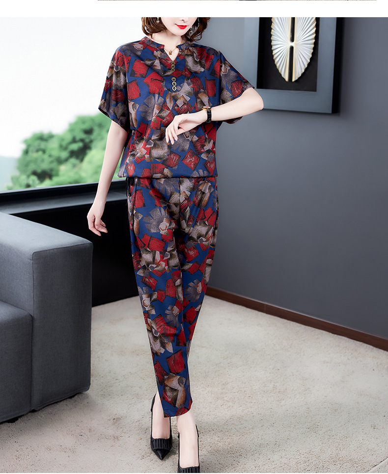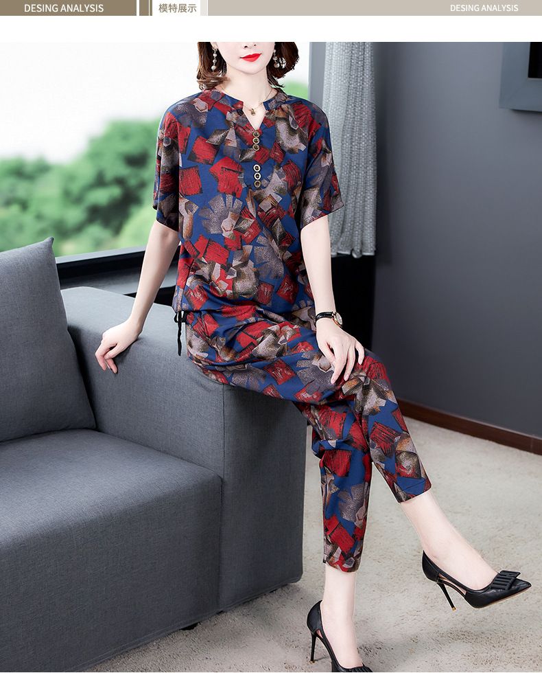 AHM-aswy3041夏新款宽松气质大码妈妈印花长裤V领五分袖两件套